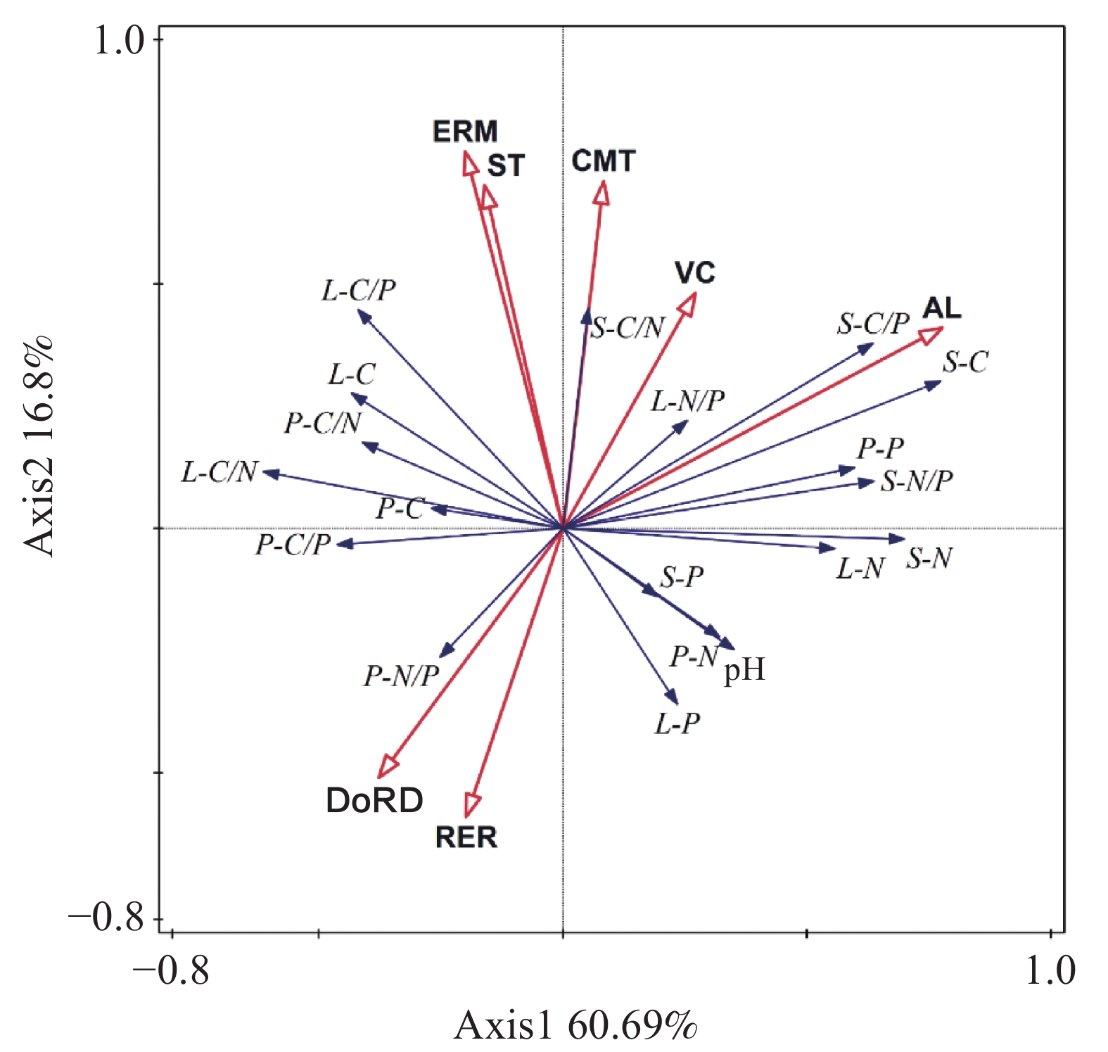 中高山岩溶区具有独特的地理和环境特征,生态系统脆弱,研究土壤–植物–凋落物的物质循环和能量流动在各个典型植被群落之间的变化,对于理解该地区的生态恢复和可持续发展具有重要意义。文章以滇西北中高山岩溶石漠化区的5种典型群落类型(草地、灌草、乔灌草–柏、纯松、乔灌草–松)选取的23个不同群落共69块样地为研究对象,分析土壤、植物和凋落物的碳(C)、氮(N)、磷(P)含量与化学计量特征,以及环境因素的影响。结果表明:(1)不同群落类型土壤C、N、P含量均值为7.46~43.25 g·kg−1、1.05~2.96 g·kg−1、0.39~0.53g·kg−1,土壤C/N、C/P、N/P计量比为8.82~23.25、21.74~105.25、2.89~6.33;植物C、N、P含量为373.79~622.87 g·kg−1、10.47~15.56 g·kg−1、1.43~2.14 g·kg−1,植物C/N、C/P、N/P计量比为27.10~65.13、272.85~624.26、7.23~10.72;凋落物C、N、P含量为334.93~491.73 g·kg−1、7.00~16.61 g·kg−1、1.16~1.53 g·kg−1,凋落物C/N、C/P、N/P计量比为23.70~72.17、238.49~499.18、7.61~17.49,不同群落类型土壤、植物和凋落物的C、N、P含量及化学计量比差异显著;(2)土壤与植物的C、N养分基本上表现出随群落类型由草地到乔木逐渐丰富的趋势,乔灌草–松、纯松、灌草阶段普遍大于草地和乔灌草–柏阶段,而凋落物则与之相反;土壤普遍缺P,但植物与凋落物中未表现出缺P;(3)土壤C/N值、C/P值、N/P值在纯松、乔灌草–松、灌草类型显著大于乔灌草–柏和草地;植物与凋落物的C/N值、C/P值乔灌草–柏类型显著大于其他类型;(4)土壤、植物和凋落物之间的养分含量呈现相关关系,群落类型、海拔、石漠化程度等环境因子对化学计量特征有显著影响,且各因子间相关性复杂,影响重要性排序为海拔>生态修复措施>石漠化程度>群落类型>土壤厚度>植被覆盖度;(5)中高山岩溶区植被生长受到N、P的共同制约,乔木群落相较草本与矮灌群落,更多受到N素的制约。