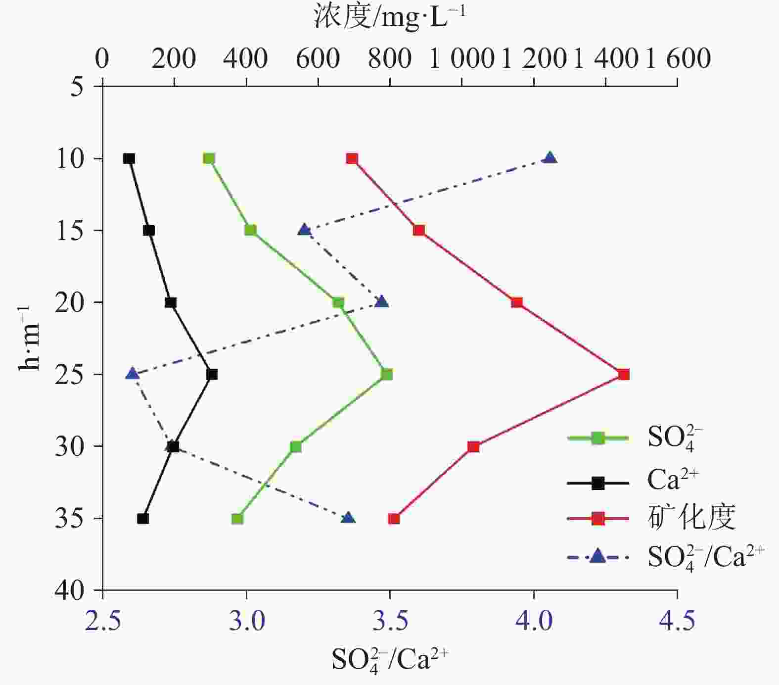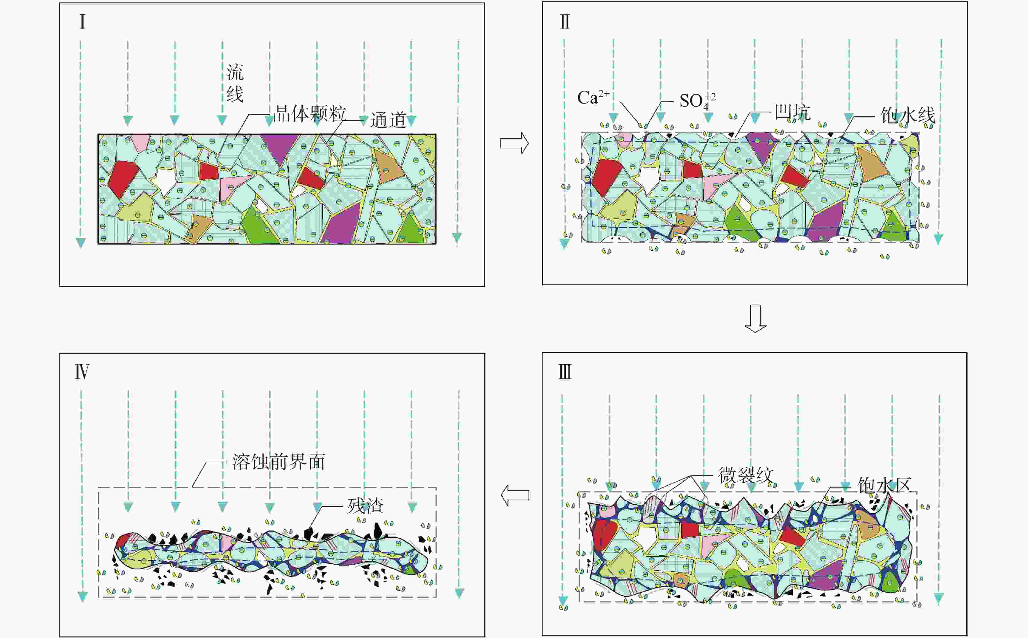 深度/mpH ${\rm{SO}}_4^{2-}$ /mg·L−1 Ca2+/mg·L−1 总矿化度/mg·L−1 ${\rm{SO}}_4^{2-}$/Ca2+ 0 d 7 d 0 d 7 d 0 d 7 d 0 d 7 d 10 7.48 296 73 693 4.1 15 7.63 412 532 129 280 879 1098 3.2 1.9 20 8.06 655 189 1152 3.5 25 7.95 790 858 304 476 1450 1590 2.6 1.8 30 7.81 536 196 1030 2.7 35 7.32 374 428 112 306 809 1054 3.4 1.4 表 3 石膏岩溶蚀速率常数与径流速度统计表