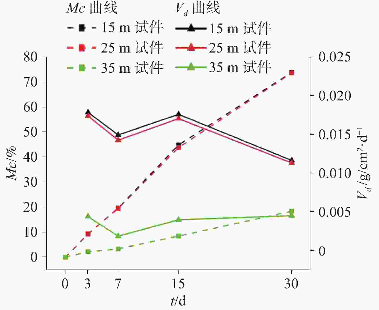 时间 t/d质量损失率 Mc/% 溶蚀速率Vd / ×10−2 g cm2·d−1 15 m 25 m 35 m 15 m 25 m 35 m 0 0.0 0.0 0.0 − − − 3 9.3 9.3 2.2 1.78 1.74 0.44 7 19.7 19.5 3.4 1.49 1.43 0.18 15 44.9 43.8 8.5 1.76 1.70 0.40 30 73.9 73.7 18.4 1.16 1.13 0.45 表 2 地下水化学特征统计表