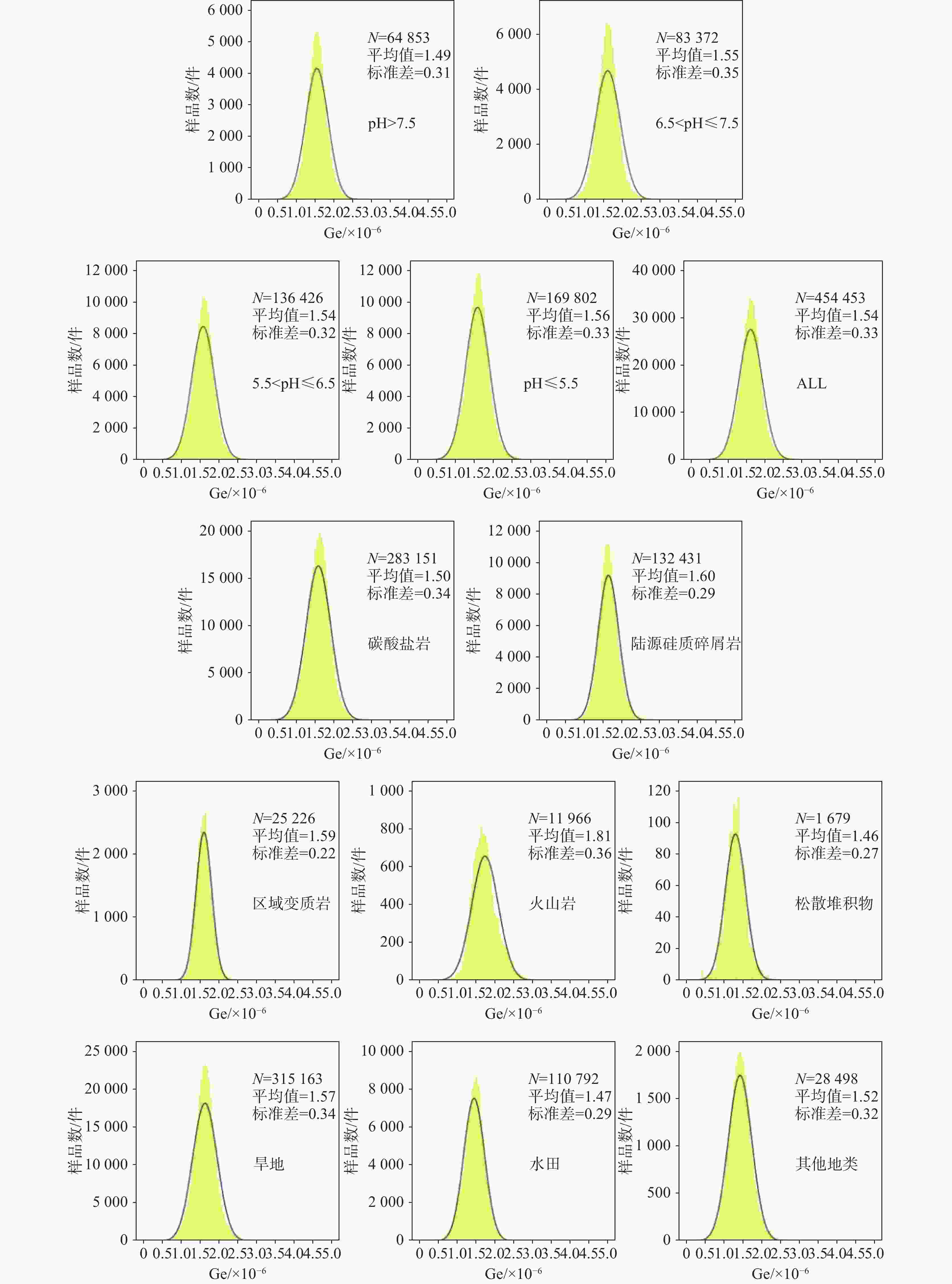大类成土母岩(质) 样本数量/件 Ge元素含量/×10−6 最大值 中位值 算术平均值 最小值 碳酸盐岩 灰岩 171210 28.69 1.54 1.52 0.04 白云岩 111941 15.60 1.44 1.44 0.10 陆源硅质碎屑岩 泥(页)岩 80635 7.88 1.62 1.63 0.19 紫红色砂岩 26232 6.35 1.55 1.57 0.14 砂岩 23155 6.97 1.46 1.49 0.12 黑色页岩 2409 2.73 1.48 1.47 0.06 火山岩 玄武岩 11966 5.64 1.78 1.81 0.05 区域