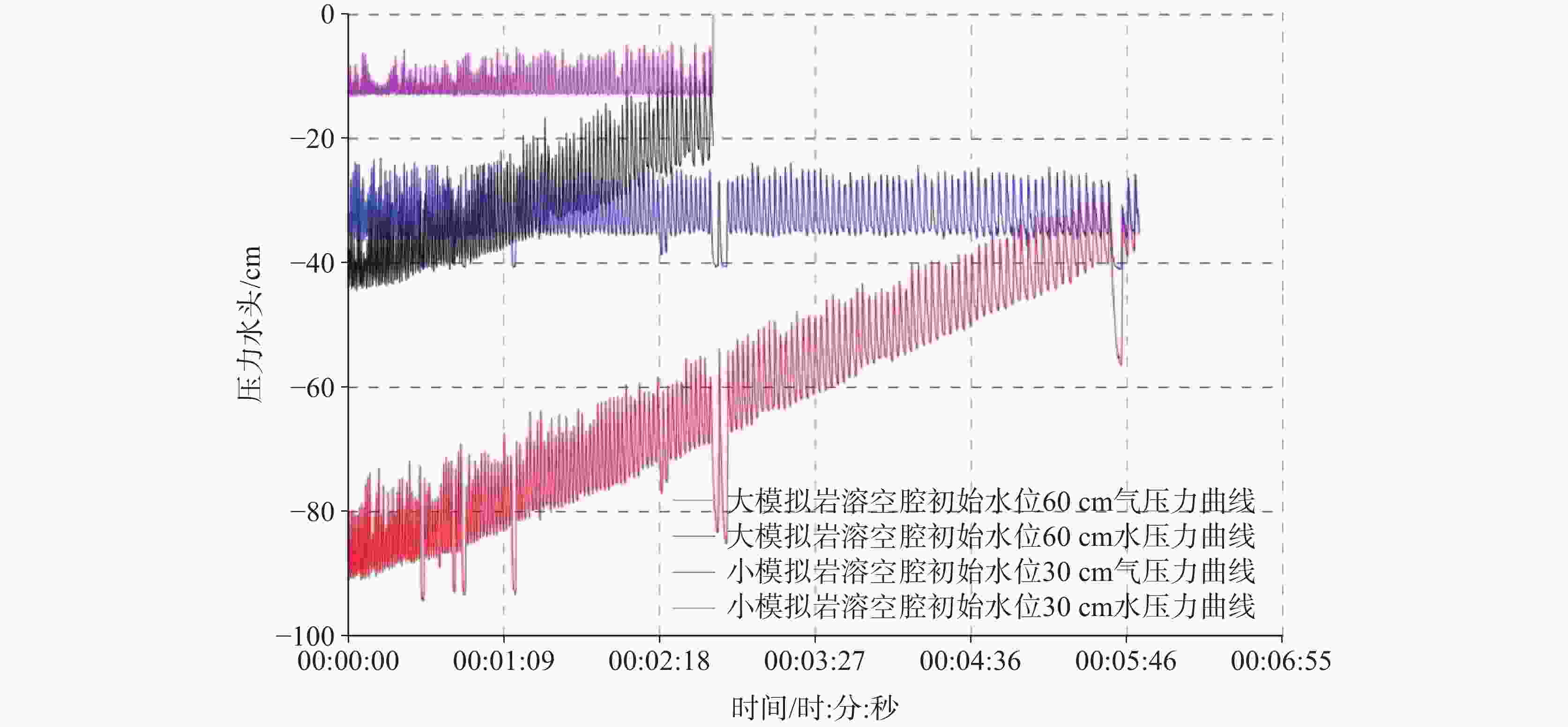 模拟岩溶空腔 空腔体积/L 气孔最大直径/cm 进/出水口直径/cm 刻度线范围/cm 侧壁水压力传感器位置/cm 小型模拟岩溶空腔 18.9 1.0 2.0 0~30 3 大型模拟岩溶空腔 100.0 2.6 2.5 0~60 7 表 2 小型模拟岩溶空腔水气平衡实验