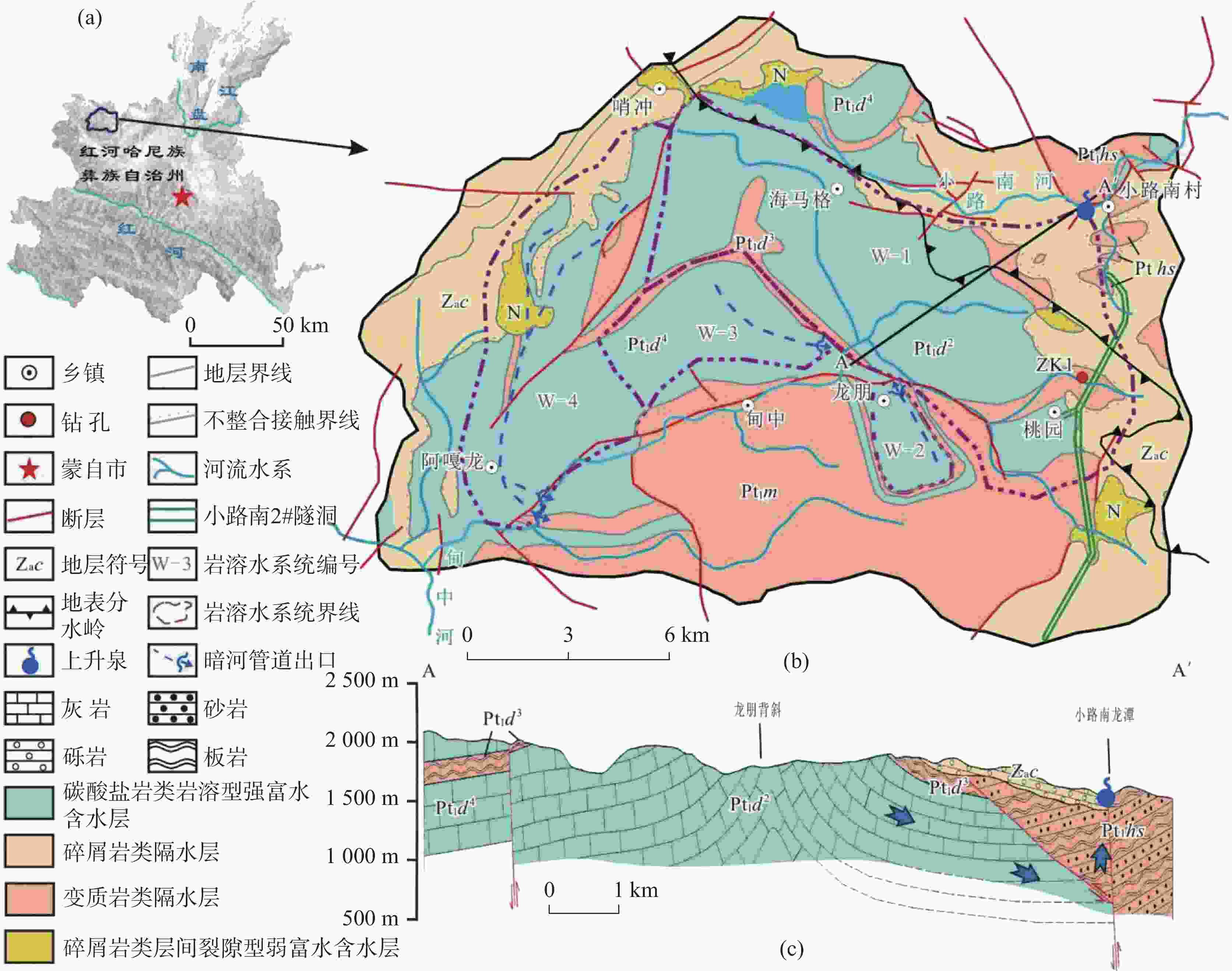 • 图  1  研究区水文地质图 (a)区域位置图(b)水文地质图(c)地质剖面图