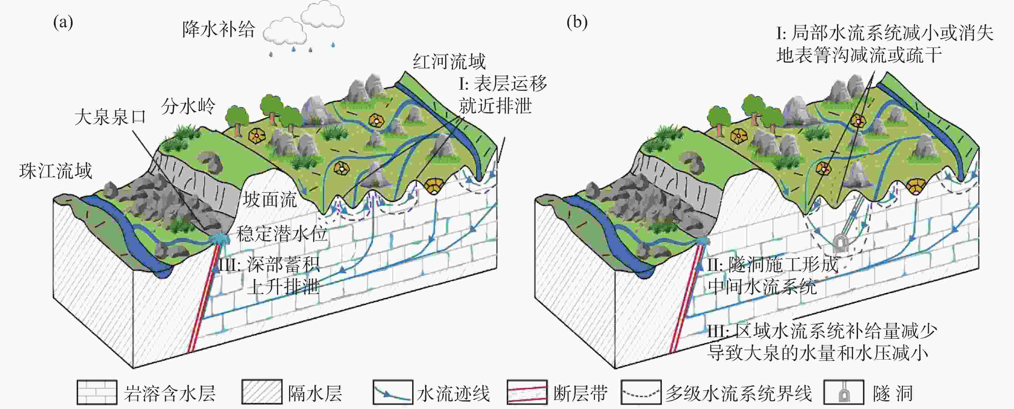 图  7  研究区多级水流系统与水循环概念模型:(a)天然状态(b)隧洞施工排水状态