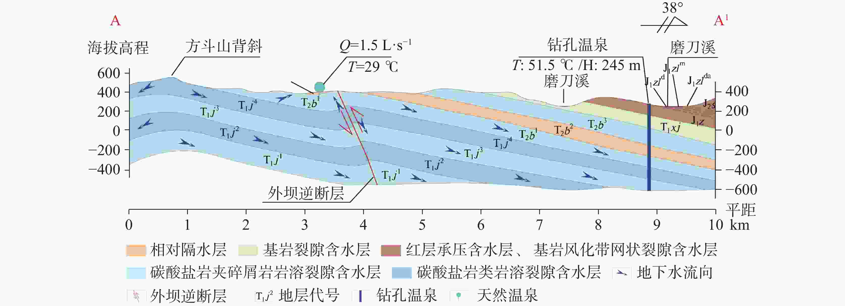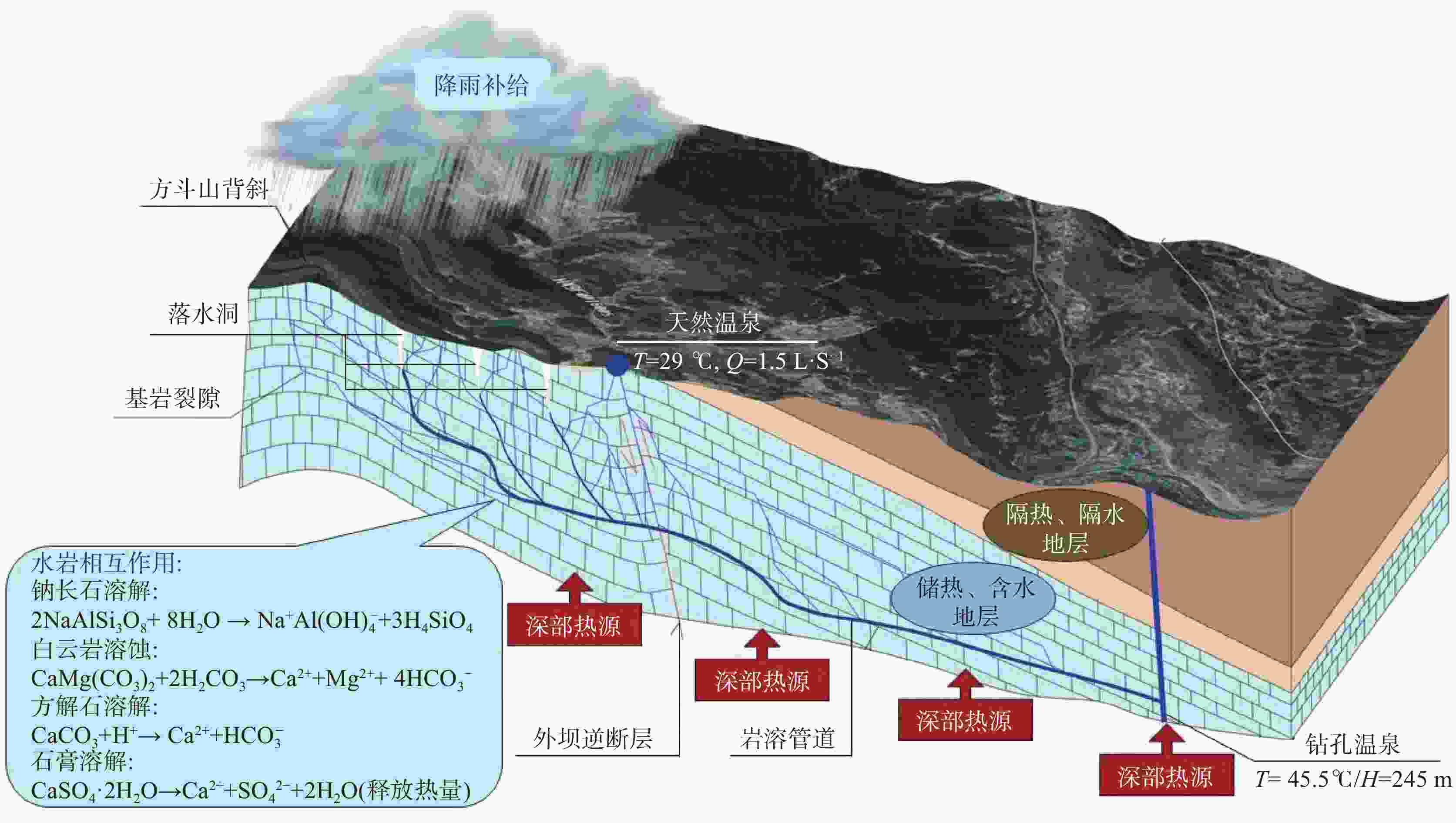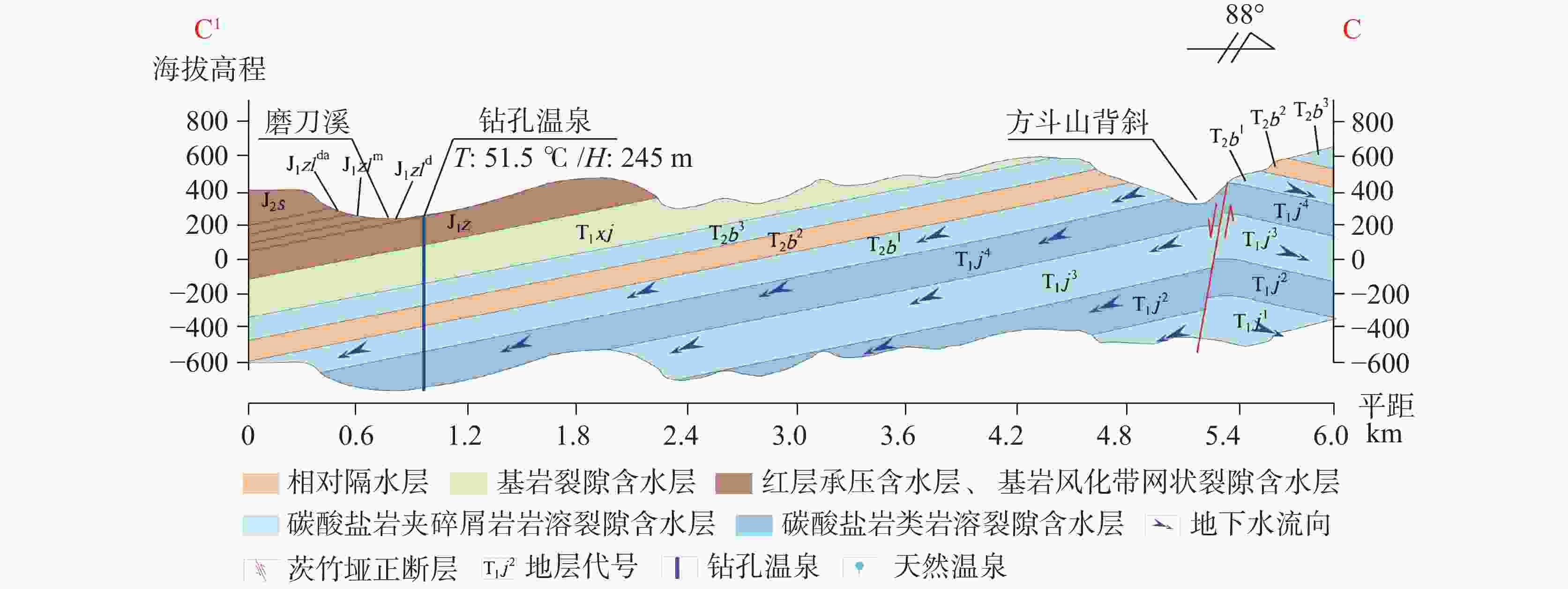 2000 m;(3)地下水系统接受方斗山背斜核部灰岩出露区大气降水入渗补给,热源机制以围岩传导热为主。Abstract:This study takes the natural and artificially drilled hot springs as the research objects located in the northwest wing of the Fangdoushan anticline in Changtan Town, Wanzhou District, Chongqing City. It systematically examines their hydrochemical characteristics, heat storage conditions, and genetic mechanisms, revealing the unique formation process of the low-temperature Cl-Na type hot springs in the high-uplift anticline region. The hot springs in the study area are located within the carbonate rock layers of the Lower Triassic Jialingjiang Formation (T1j), and are controlled by the combined effect of the Fangdoushan anticline structure and local hydrogeological conditions. Through hydrogeochemical analysis, geothermal temperature scale calculations, and hydrogeological conceptual model analysis, the following key conclusions are drawn: 1. Chemical characteristics and genesis of water (1) The chemical composition of the hot spring water is classified as Cl-Na type (according to the Piper three-line graph). The pH is weakly alkaline (7.26 to 7.87). The mineralization degree is significantly higher than the regional background level, TDS up to 11.25 g·L−1. The proportions of Cl− and Na+ are 36.72% and 55.37%, respectively.(2) The high mineralization degree stems from the concentrated halogen dissolution and filtration in the tidal flat-lagoon facies strata of the Triassic Jialingjiang Formation (T1j), as well as the water-rock interactions during the deep circulation processes (such as dolomite dissolution and sodium growth petrification). Additionaly, sulfate reduction reactions involving microorganisms (e.g., H2S generation) and long-range migration (>10 km) further enhance ion enrichment.(3) The content of Sr2+ among the trace elements is notably high (37.06 mg·L−1), and its source is closely related to the water-rock interactions involving carbonate rocks and gelatinate layers in the Triassic Jialingjiang Formation (T1j). 2. Heat storage conditions and circulation mechanism (1) The calculation of geothermal temperature scales (quartz, chalcedony, and quartzite) shows that the heat storage temperature ranges from 54 ℃ to 78 ℃, with an average of 65.4 ℃, classifying it as a low-temperature geothermal system. Based on the ground temperature gradient, the circulation depth is estimated to be approximately 2,000 meters.(2) The heat storage layer is composed of interbedded limestone and dolomite from the Triassic Jialingjiang Formation (T1j), which overlies the mudstone of the second section of the Badong Formation (T2b2), the clastic rocks of the Triassic Xujiahe Formation (T3xj), and the sand-mudstone of the Jurassic system. Together, these formations create a water-proof and heat-insulating cover layer, thereby forming a closed heat storage structure. 3. Groundwater recharge sources and heat sources (1) Recharge sources: Atmospheric precipitation in the exposed area of the Triassic Jialingjiang Formation (T1j) at the core of the Fangdoushan anticline infiltrates in through karst fissures and sinkholes, generating deep runoff.(2) Runoff path: Groundwater migrates deeper along the fault-fracture system at the wing of the anticline, absorbs heat from the surrounding rock, and undergoes dissolution and filtration, with a retention time of several hundred years.(3) Heat source: There is no additional heat source, such as magmatic activity. The heat originates from the normal geothermal gradient (2.5 to 3.0 ℃·100 m−1), and the formation of the heat reservoir is driven by the warming of the stratum. 4. Three-dimensional genesis conceptual model (1) After the infiltrating as atmospheric precipitation, the water migrates deeper along the fracture network at the core of the anticline. It undergoes long-path circulation (approximately 2,000 meters) and slow warming, accompanied by intense water-rock interaction with salt-bearing carbonate rocks. (2) Deep faults, such as the outer dam reverse fault, act as secondary hydrothermal channels that locally supplement solutes and heat; however, the main heat source remains the natural warming of the crust. (3) Hydrogeological sections reveal that the combination of an aquifer and impermeable layer under the control of anticline structures, is the key to the occurrence and migration of thermal fluids. The mudstone of the Triassic Badong Formation (T2b) effectively blocks vertical heat loss and maintains the stability of thermal reservoirs. -