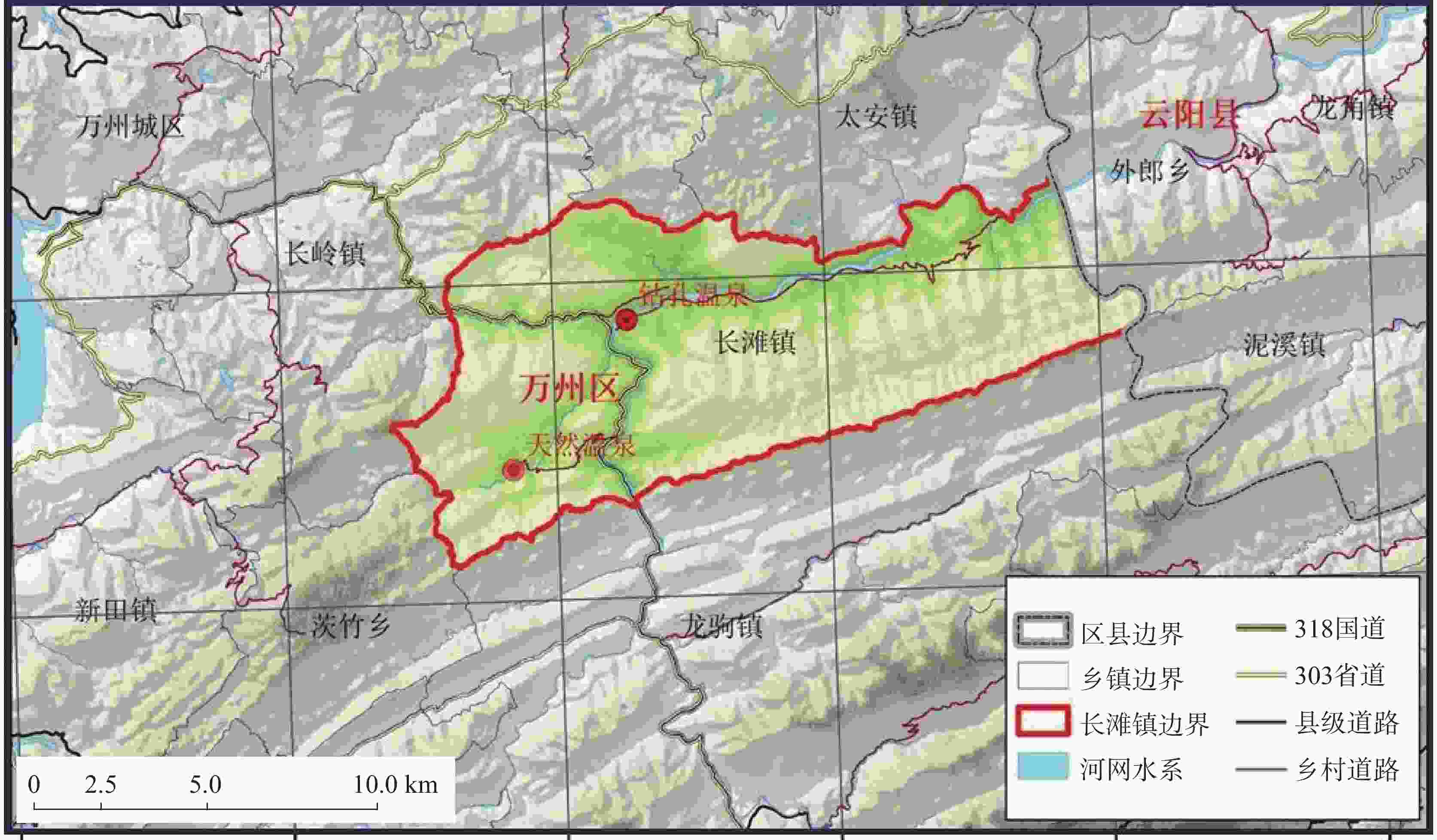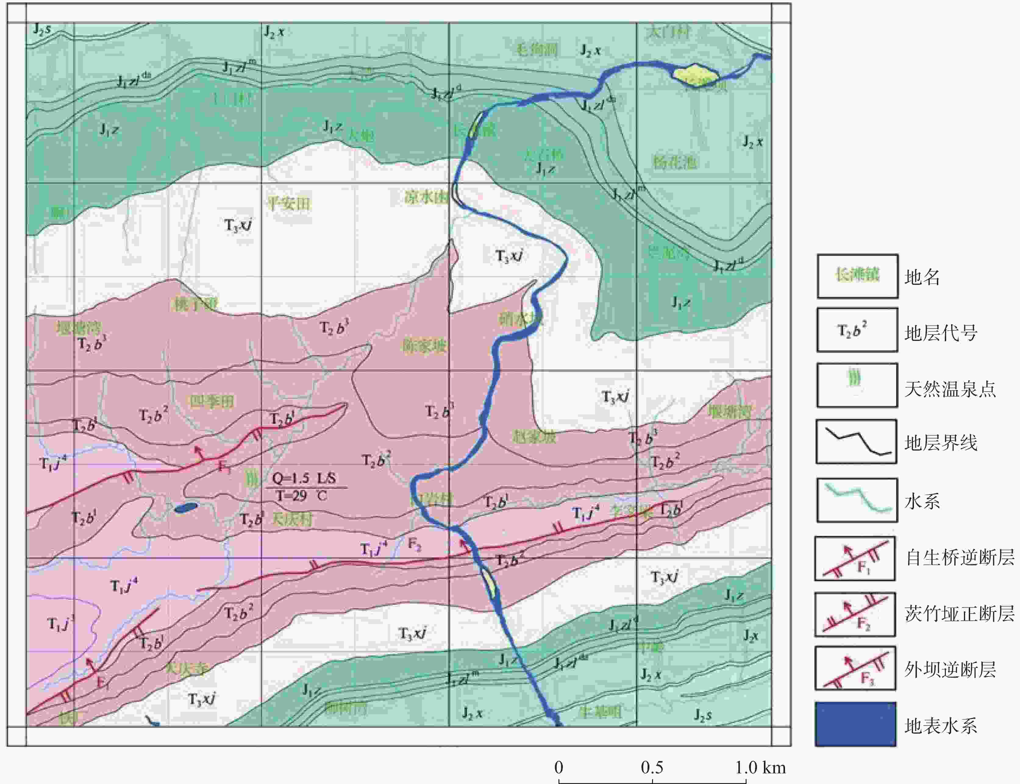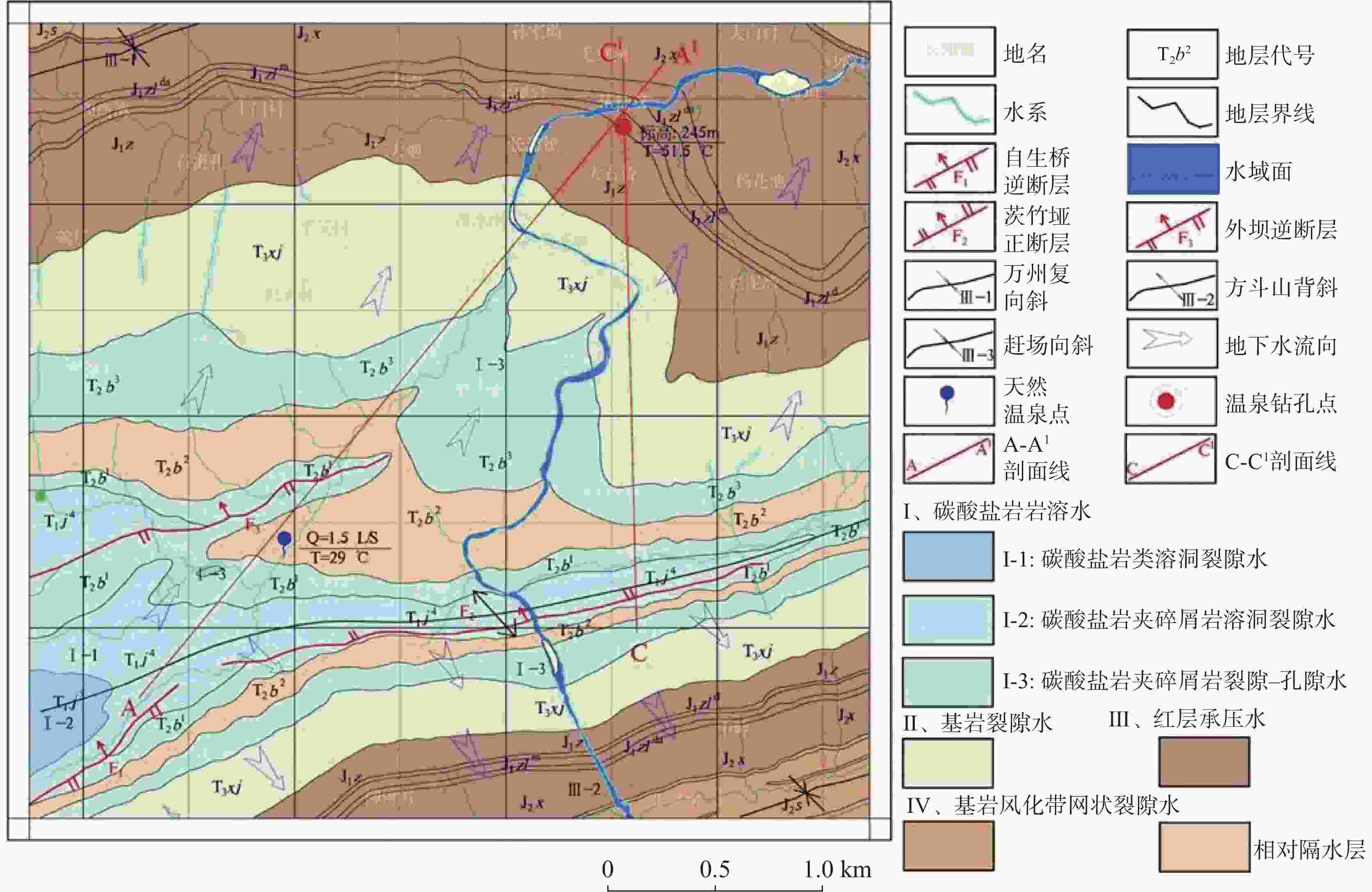 2000 m;(3)地下水系统接受方斗山背斜核部灰岩出露区大气降水入渗补给,热源机制以围岩传导热为主。Abstract:This study takes the natural and artificially drilled hot springs as the research objects located in the northwest wing of the Fangdoushan anticline in Changtan Town, Wanzhou District, Chongqing City. It systematically examines their hydrochemical characteristics, heat storage conditions, and genetic mechanisms, revealing the unique formation process of the low-temperature Cl-Na type hot springs in the high-uplift anticline region. The hot springs in the study area are located within the carbonate rock layers of the Lower Triassic Jialingjiang Formation (T1j), and are controlled by the combined effect of the Fangdoushan anticline structure and local hydrogeological conditions. Through hydrogeochemical analysis, geothermal temperature scale calculations, and hydrogeological conceptual model analysis, the following key conclusions are drawn: 1. Chemical characteristics and genesis of water (1) The chemical composition of the hot spring water is classified as Cl-Na type (according to the Piper three-line graph). The pH is weakly alkaline (7.26 to 7.87). The mineralization degree is significantly higher than the regional background level, TDS up to 11.25 g·L−1. The proportions of Cl− and Na+ are 36.72% and 55.37%, respectively.(2) The high mineralization degree stems from the concentrated halogen dissolution and filtration in the tidal flat-lagoon facies strata of the Triassic Jialingjiang Formation (T1j), as well as the water-rock interactions during the deep circulation processes (such as dolomite dissolution and sodium growth petrification). Additionaly, sulfate reduction reactions involving microorganisms (e.g., H2S generation) and long-range migration (>10 km) further enhance ion enrichment.(3) The content of Sr2+ among the trace elements is notably high (37.06 mg·L−1), and its source is closely related to the water-rock interactions involving carbonate rocks and gelatinate layers in the Triassic Jialingjiang Formation (T1j). 2. Heat storage conditions and circulation mechanism (1) The calculation of geothermal temperature scales (quartz, chalcedony, and quartzite) shows that the heat storage temperature ranges from 54 ℃ to 78 ℃, with an average of 65.4 ℃, classifying it as a low-temperature geothermal system. Based on the ground temperature gradient, the circulation depth is estimated to be approximately 2,000 meters.(2) The heat storage layer is composed of interbedded limestone and dolomite from the Triassic Jialingjiang Formation (T1j), which overlies the mudstone of the second section of the Badong Formation (T2b2), the clastic rocks of the Triassic Xujiahe Formation (T3xj), and the sand-mudstone of the Jurassic system. Together, these formations create a water-proof and heat-insulating cover layer, thereby forming a closed heat storage structure. 3. Groundwater recharge sources and heat sources (1) Recharge sources: Atmospheric precipitation in the exposed area of the Triassic Jialingjiang Formation (T1j) at the core of the Fangdoushan anticline infiltrates in through karst fissures and sinkholes, generating deep runoff.(2) Runoff path: Groundwater migrates deeper along the fault-fracture system at the wing of the anticline, absorbs heat from the surrounding rock, and undergoes dissolution and filtration, with a retention time of several hundred years.(3) Heat source: There is no additional heat source, such as magmatic activity. The heat originates from the normal geothermal gradient (2.5 to 3.0 ℃·100 m−1), and the formation of the heat reservoir is driven by the warming of the stratum. 4. Three-dimensional genesis conceptual model (1) After the infiltrating as atmospheric precipitation, the water migrates deeper along the fracture network at the core of the anticline. It undergoes long-path circulation (approximately 2,000 meters) and slow warming, accompanied by intense water-rock interaction with salt-bearing carbonate rocks. (2) Deep faults, such as the outer dam reverse fault, act as secondary hydrothermal channels that locally supplement solutes and heat; however, the main heat source remains the natural warming of the crust. (3) Hydrogeological sections reveal that the combination of an aquifer and impermeable layer under the control of anticline structures, is the key to the occurrence and migration of thermal fluids. The mudstone of the Triassic Badong Formation (T2b) effectively blocks vertical heat loss and maintains the stability of thermal reservoirs. -