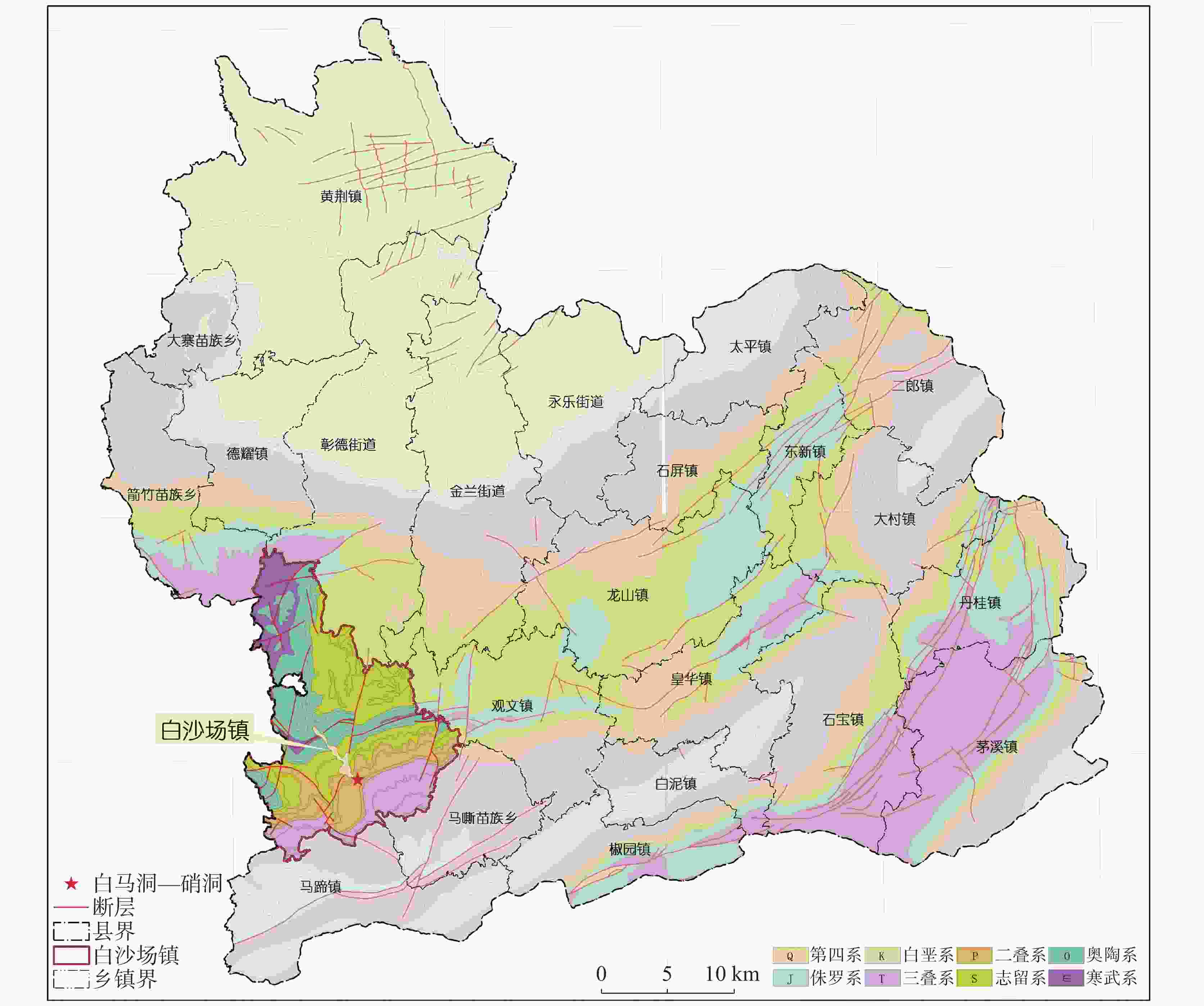 • 图  1  古蔺县地质概图及白沙场镇白马洞—硝洞位置图(根据1∶20万地质图改绘)