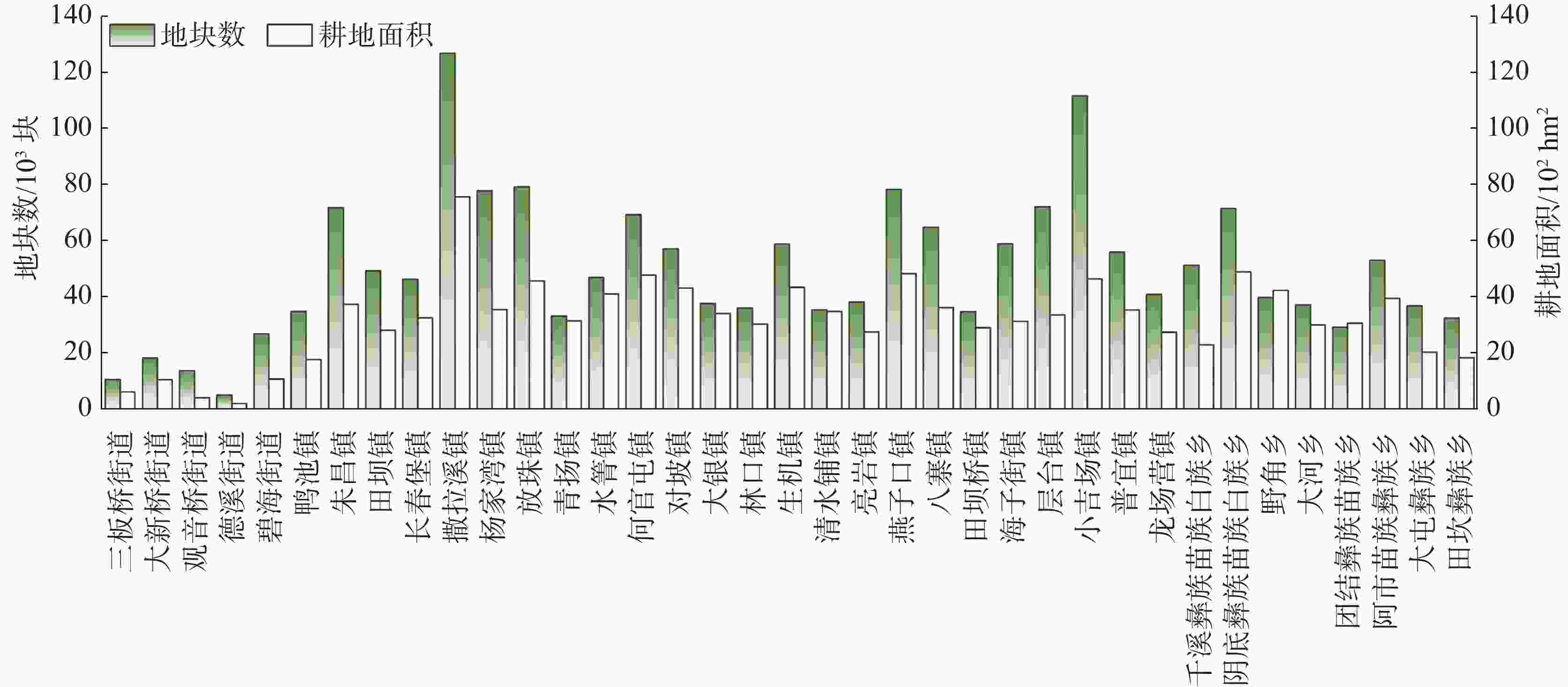 地貌类型 海拔/m 地形起伏度/m 坡度/° 坝地 − <50 <8 丘陵 − [50,200) [8,30) 低山 [500, 1000 )≥200 ≥30 中山 [ 1000 ,2500 )− − 表 2 七星关区耕地景观和权属细碎化评价指标体系