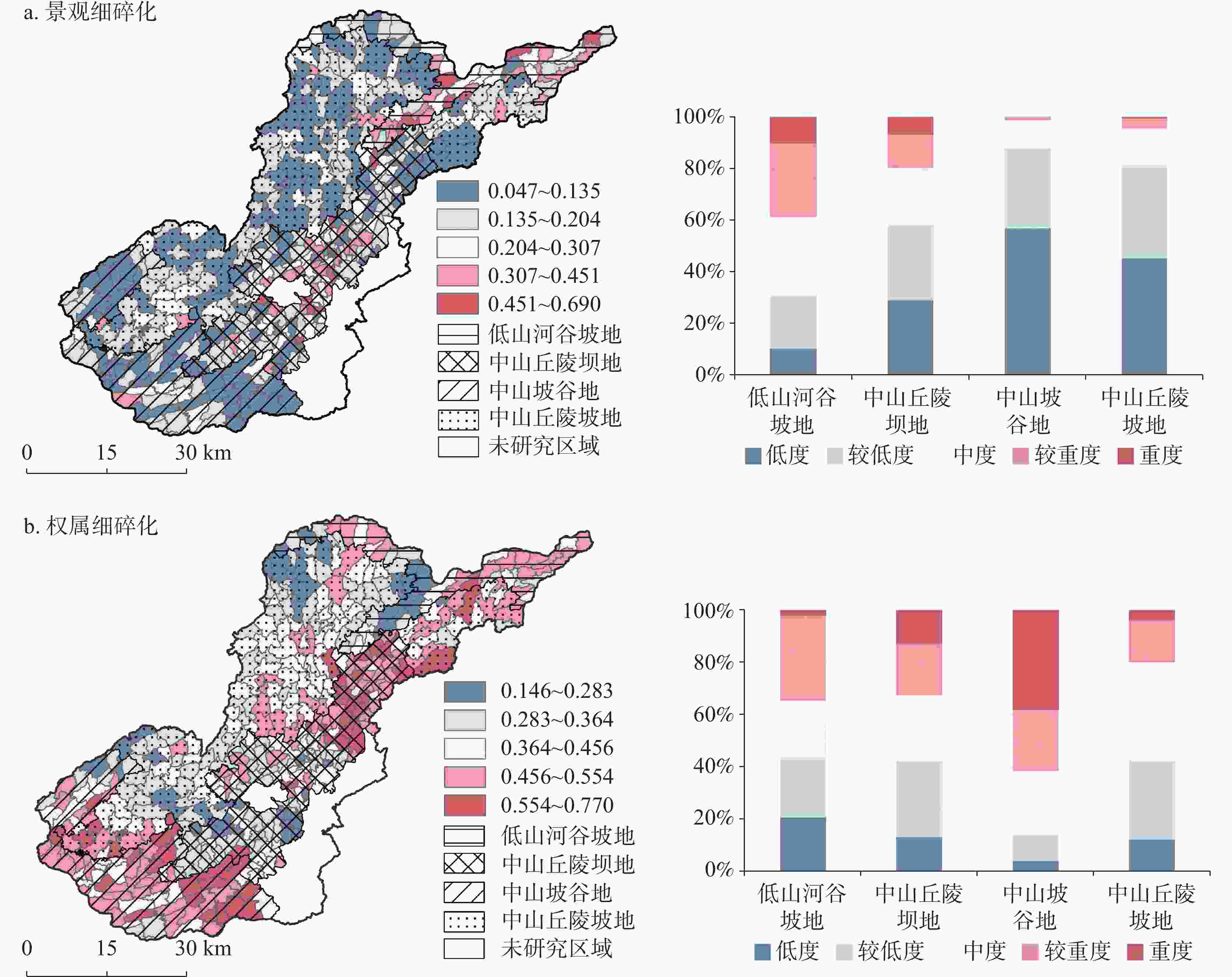 细碎化 地貌分区 低度 较低度 中度 较重度 重度 景观细碎化 低山河谷坡地 5(10.20) 10(20.41) 15(30.61) 14(28.57) 5(10.20) 中山丘陵坝地 47(29.01) 47(29.01) 36(22.22) 21(12.96) 11(6.79) 中山坡谷地 46(56.79) 25(30.86) 9(11.11) 1(1.23) 0(0.00) 中山丘陵坡地 84(45.41) 65(35.14) 28(15.14) 7(3.78) 1(0.54) 182(38.16) 147(30.82) 88(18.45) 43(9.22) 17(3.35) 权属细碎化 低山河谷坡地 10(20.41) 11(22.45) 11(22.45) 16(32.65) 1(2.04) 中山丘陵坝地 21(12.96) 47(29.01) 41(25.31) 32(19.75) 21(12.96) 中山坡谷地 3(3.70) 8(9.88) 20(24.69) 19(23.46) 31(38.27) 中山丘陵坡地 22(11.89) 56(30.27) 70(37.84) 30(37.84) 7(3.78) 55(11.74) 122(25.58) 142(29.77) 97(20.34) 60(12.58) 表 5 不同地貌分区行政村个数及占比情况