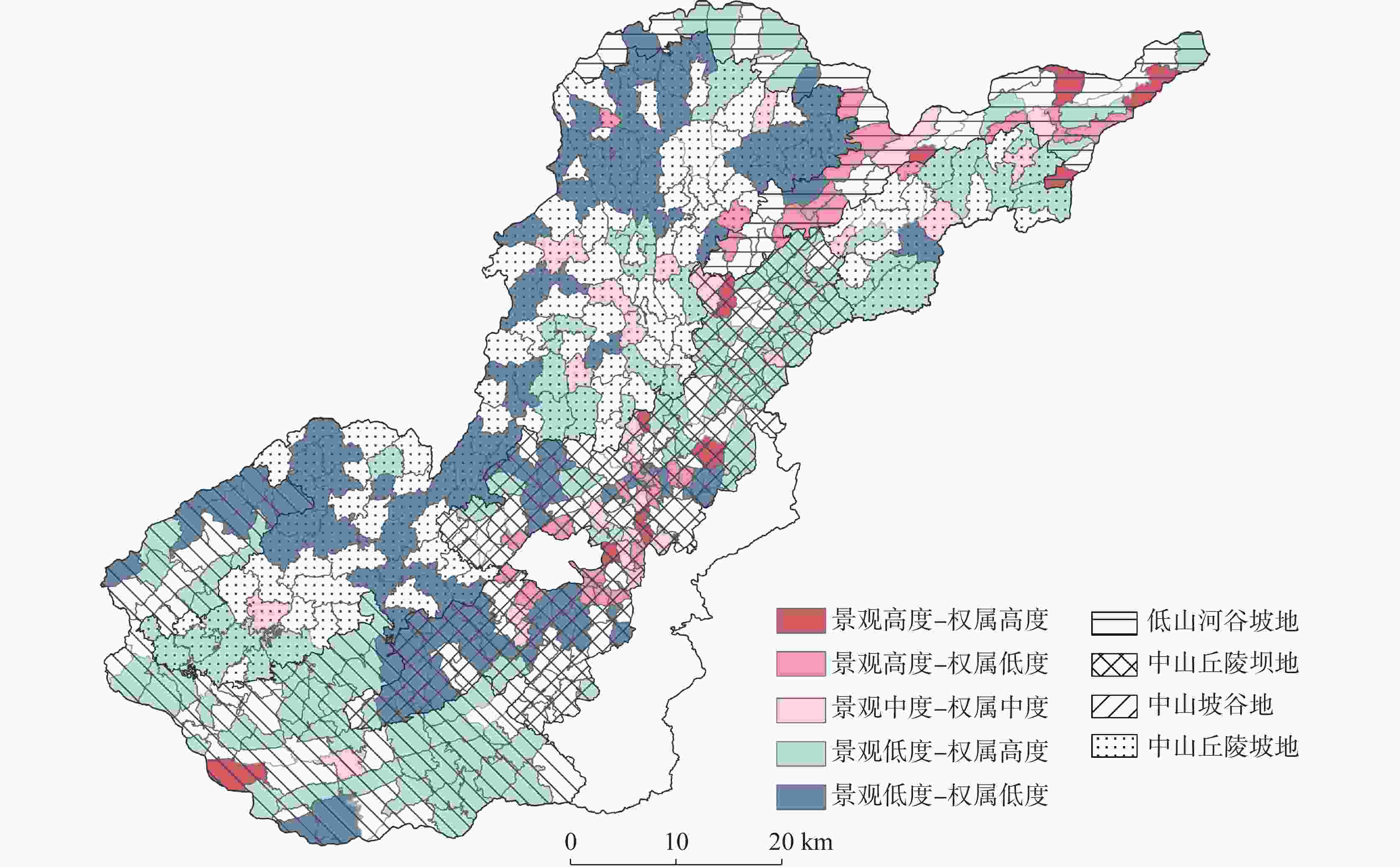 类型 景观指数 权属指数 全局Moran I 指数 0.2882 0.5481 预期指数 − 0.0021 − 0.0021 检验统计量z 10.6733 19.9652 p-value 0 0 表 7 地貌分区与耕地细碎化指数空间自相关对应的行政村数量