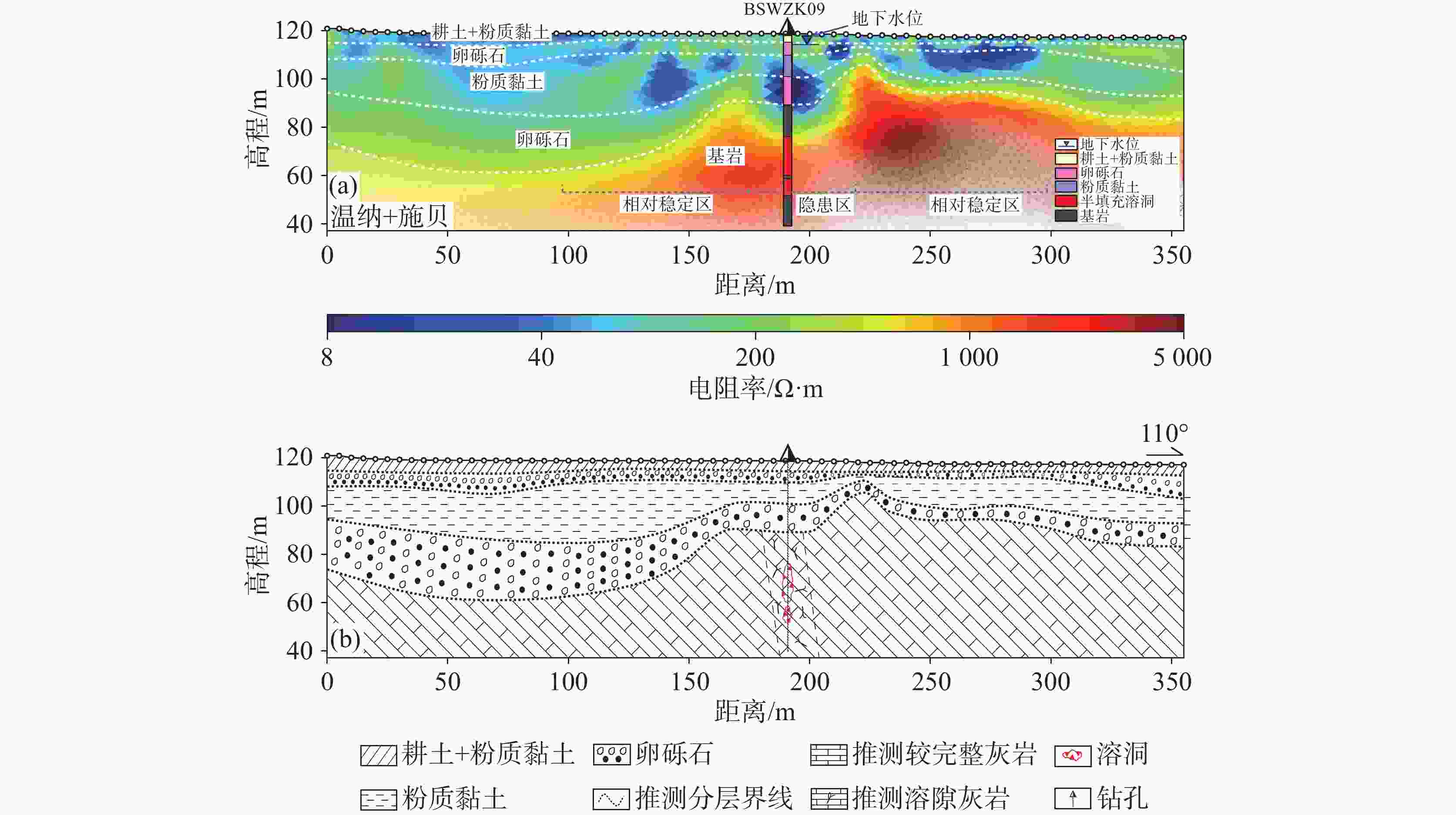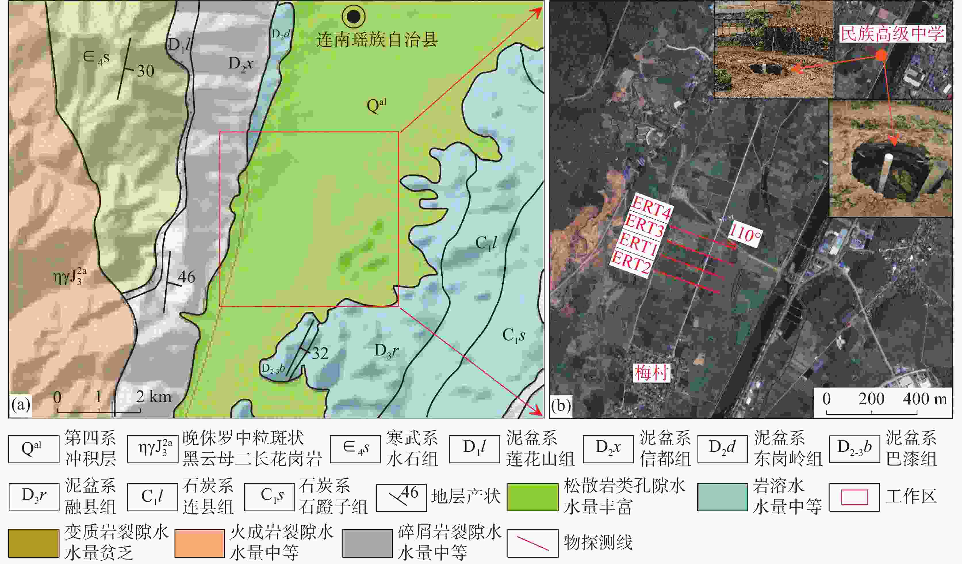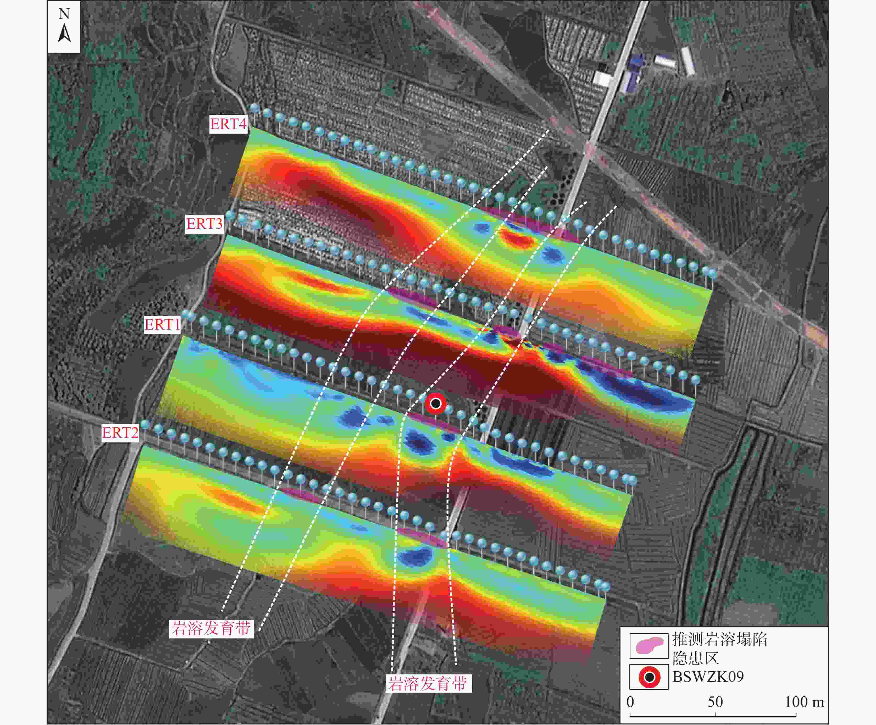 In covered karst areas, the Quaternary overburden is connected to underlying karst cavities and fissure networks, making these regions susceptible to karst ground collapses due to natural or anthropogenic factors. The northwestern Guangdong region is widely distributed with extensive carbonate rock formations where karst processes are prominent. In recent years, the increasing frequency of extreme climate events has intensified the occurrence of shallow covered karst collapse disasters in this area. These disasters are widespread, highly concealed, and sudden, posing a significant threat to the safety of lives and property. Therefore, studying the geological structural characteristics of potential karst ground collapse zones is of considerable practical significance and profound social value. The high-density resistivity method comprises a set of direct current (DC) electrical exploration techniques that exploit the differences in electrical properties between subsurface targets and surrounding media. This method involves artificially establishing a stable DC electric field underground and performing scanning observations using a predetermined electrode array configuration. By analyzing extensive spatial variations in resistivity within a specific subsurface area, it enables the investigation and elucidation of relevant geological issues. The high-density electrical method has proven valuable in various scenarios involving karst ground collapses. For example, in geological surveys of covered karst areas, the Wenner quadrupole array has been used to detect underground cavities, yielding results that align well with borehole data. Therefore, this study selects a typical shallow covered karst collapse-prone area in Liannan county, Qingyuan City, to investigate the distribution and development characteristics of underground karst using the high-density electrical method combined with drilling. First, the profile of a high-density electrical test was established in Meicun, Liannan county, where data were collected using both the Wenner and Schlumberger array. Inversion was performed on the respective datasets as well as on the combined array data. The inversion profiles clearly reveal significant high-resistivity zones interspersed with low-resistivity anomalies. The Wenner array inversion profile displays a relatively wide low-resistivity anomaly zone located between 185 m and 225 m along the survey line, with a lateral extent of about 40 m and a depth of about 30 m, covering an area of approximately 1,200 m2. However, the resistivity contour anomaly zone is not distinctly delineated. In contrast, the Schlumberger array inversion profile reveals a narrower anomaly zone located between 180 m and 205 m along the survey line, with a lateral extent of about 25 m and a depth of about 25 m, covering an area of approximately 625 m2. The resistivity contour anomaly zone is more clearly defined, exhibiting sharper lateral boundaries. The combined array provides a more refined depiction of the anomaly zone, better constraining the subsurface anomaly. By integrating borehole data, it was concluded that both arrays accurately reflect the low-resistivity anomaly zone. In terms of detection objectives, the Wenner array is better suited for identifying layered structures, while the Schlumberger array excels at delineating anomalous bodies. Simultaneously, joint inversion of the combined arrays leverages the strengths of each array to improve resolution. Second, analysis of the single-point apparent resistivity sounding curve extracted from borehole locations shows that the resistivity value is about 100 Ω·m at the minimum electrode spacing of 7.5 m. As the spacing increases, the resistivity gradually decreases, stabilizing at 22.5 m, followed by a turning point of increasing resistivity at 27.5 m, which is inferred to be the rock-soil interface. As the resistivity continues to rise, a V-shaped anomaly appears in the 47.5 to 57.5 m segment, likely caused by karst fissures or partially to fully filled cavities. The anomaly location on the sounding curve aligns well with borehole findings. Finally, the high-density electrical method was applied to analyze the study area. The results indicate the followings, (1) Different acquisition arrays exhibit distinct characteristics in the resistivity contours of the same target during inversion. Therefore, the optimal array should be selected based on the detection objective prior to fieldwork, and combining multiple arrays can enhance resolution. (2) Integrating high-density electrical inversion results with single-point apparent resistivity sounding curves can improve the accuracy of borehole placement. (3) The high-density electrical method can precisely delineate the rock-soil interface, measure overburden thickness, and successfully identify eight karst anomaly zones and two underground karst development belts. These geophysical inferences show strong consistency with verification borehole data. (4) This study successfully delineated eight potential karst collapse hazard zones. Overall, the research demonstrates that the high-density electrical method is highly effective in identifying cavities and karst fissure zones, providing critical and reliable support for subsequent prevention and mitigation efforts. -