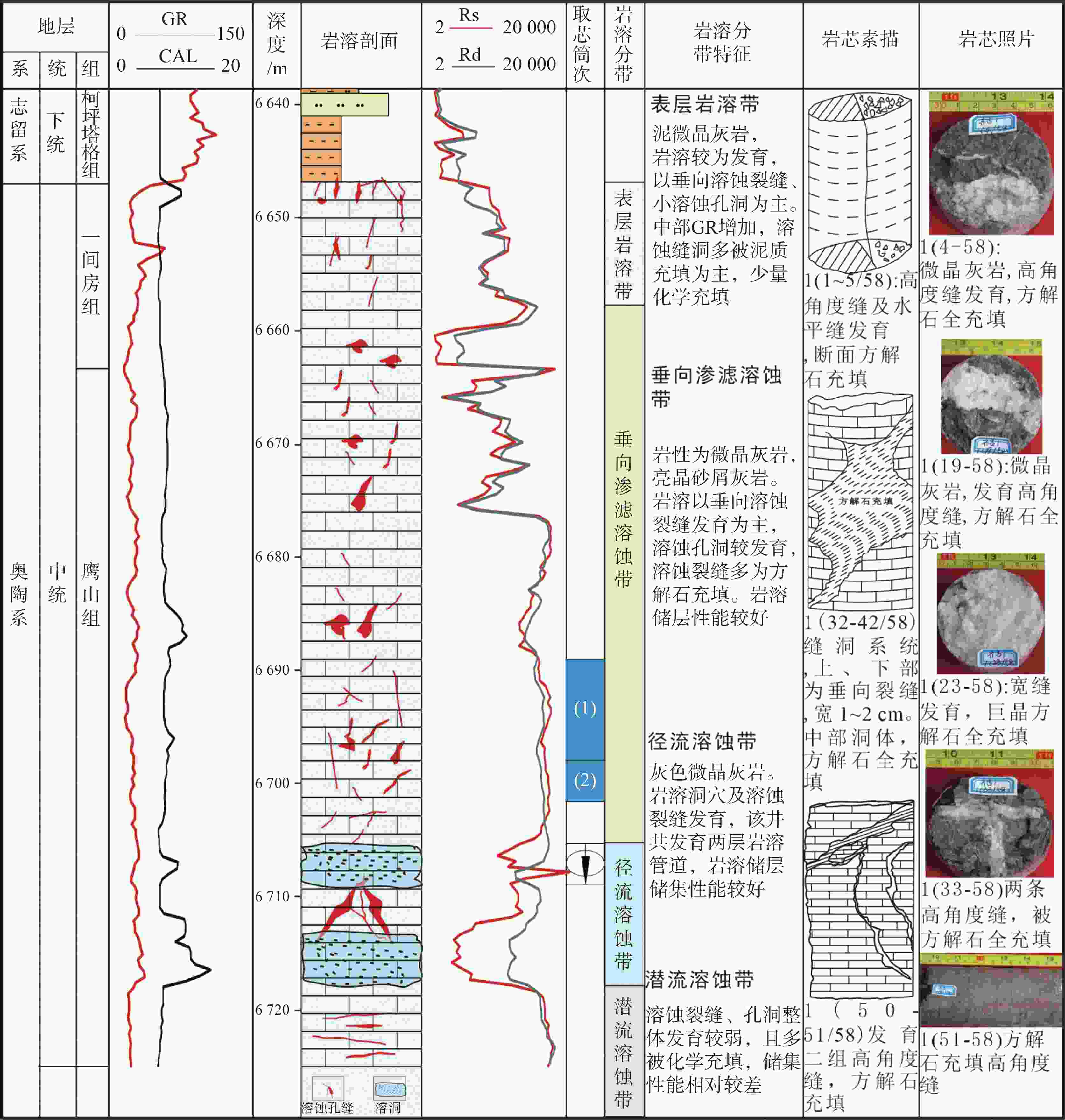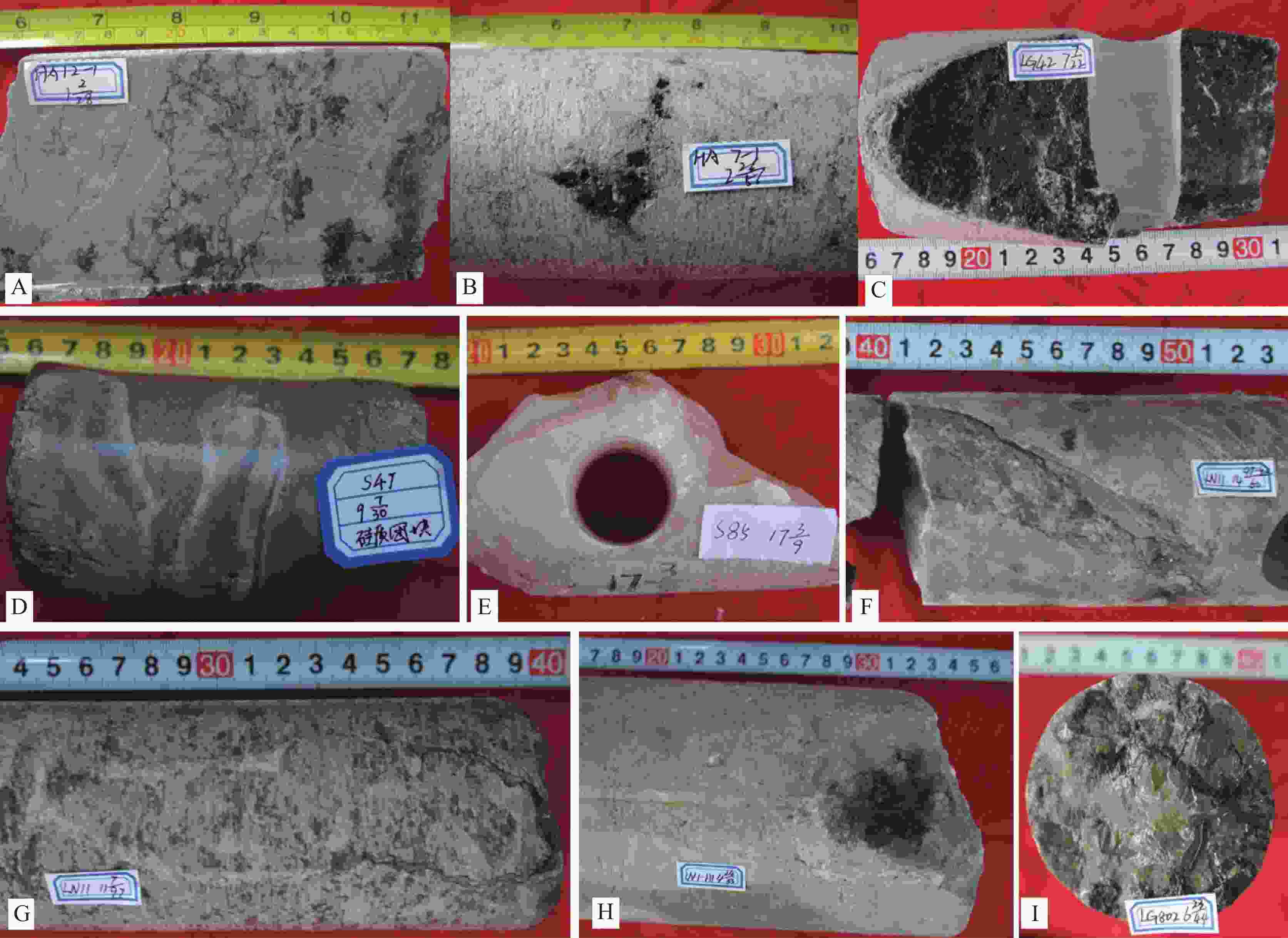 A. H12-1 发育压溶缝,黑色有机质充填 B. H7-1 发育溶蚀孔,方解石半充填,后期油气充注 C. L42 发育高角度缝,方解石沿缝壁一期充填,后期充填黑色有机质 D. S47 发育硅质团块 E. S85 发育溶洞,伟晶方解石充填 F. L11 发育溶洞,灰绿色钙泥质、岩溶角砾与黄铁矿晶体混合充填 G. L11 发育高角度缝,灰绿色钙泥质全充填 H. L1 发育溶洞,灰绿色钙泥质及黄铁矿充填 I. 发育高角度缝,灰黑色有机质及钙泥质一期充填,方解石二期充填