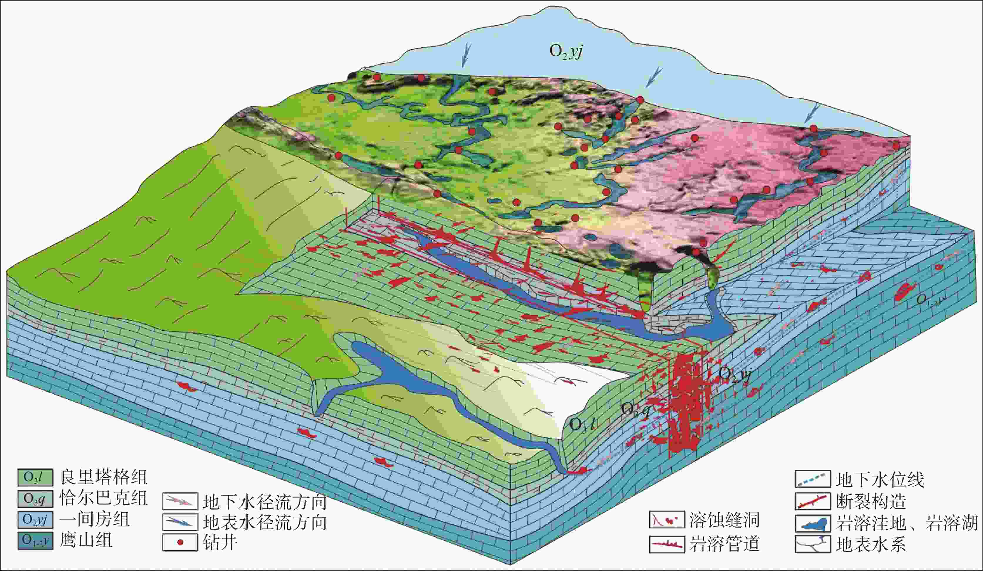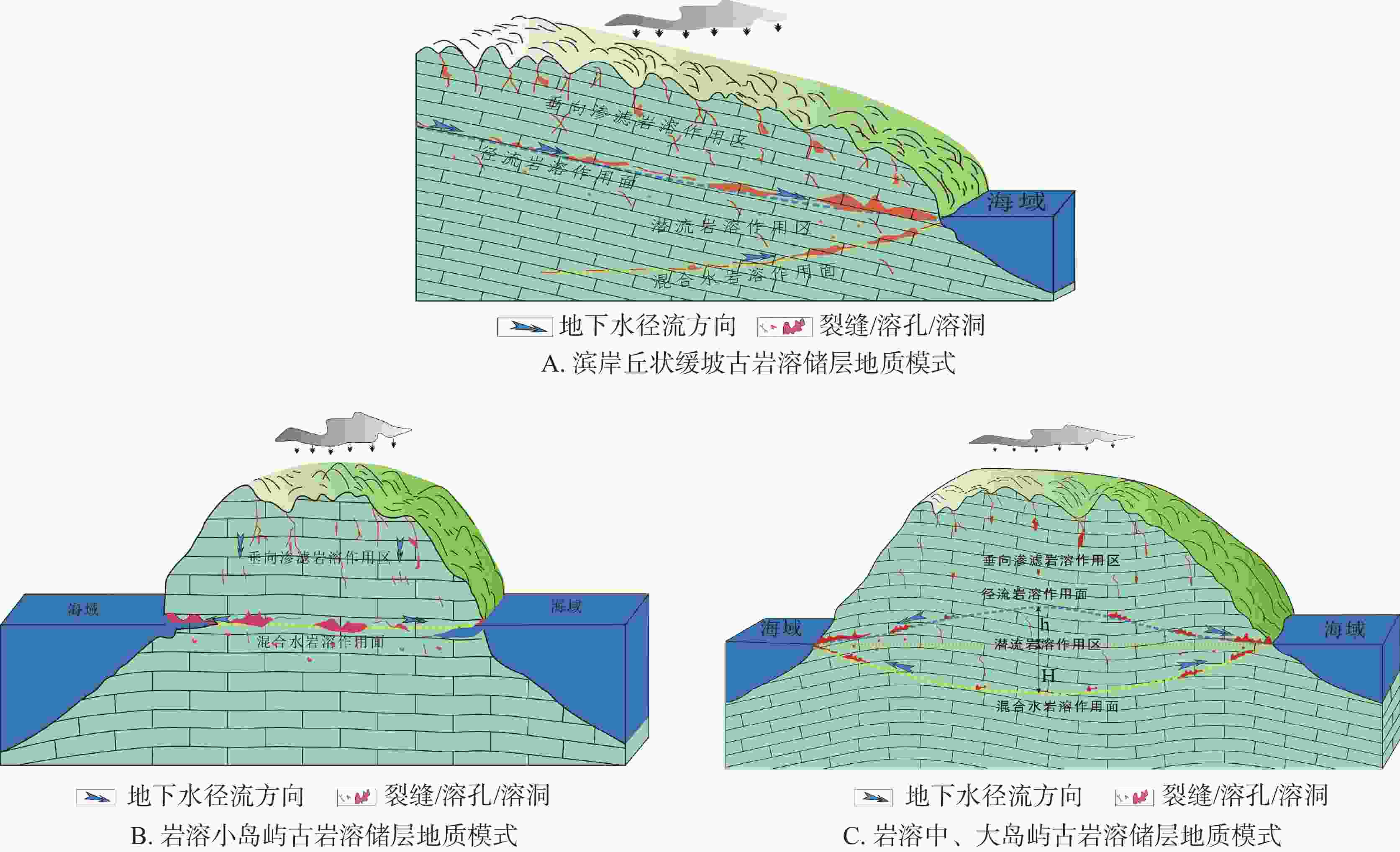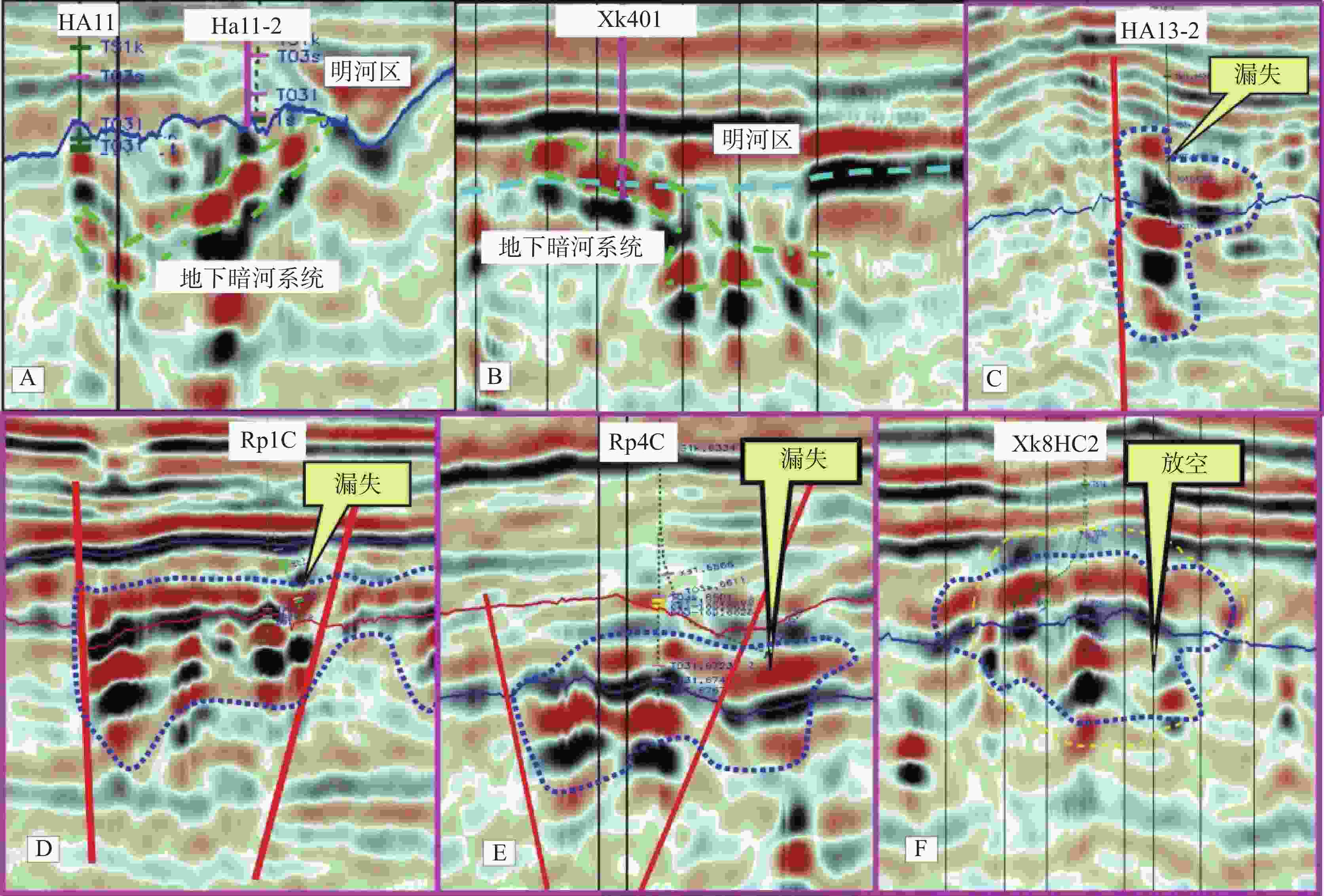 A. 发育流入型地下暗河系统 B. 发育流出型地下暗河系统 C. 发育孤立溶洞型地下缝洞系统 D-F. 发育大型古岩溶缝洞储集体
