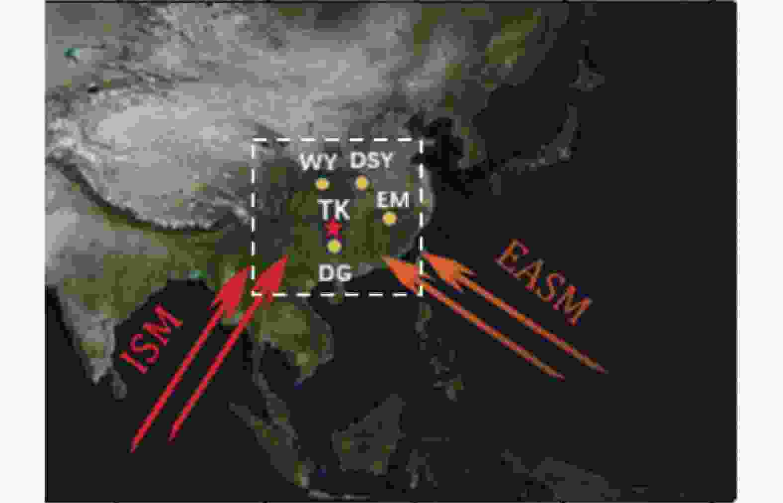 红色箭头指示印度夏季风(ISM,Indian Summer Monsoon)轨迹,橙色箭头指示东亚夏季风(EASM,East Asian Summer Monsoon)轨迹。天坑洞(TK,红星)及相关洞穴所在位置(黄色圆形),包括峨眉洞(EM)[16]、董哥洞(DG)[24]、东石崖洞(DSY)[25]、乌鸦洞(WY)[26]。