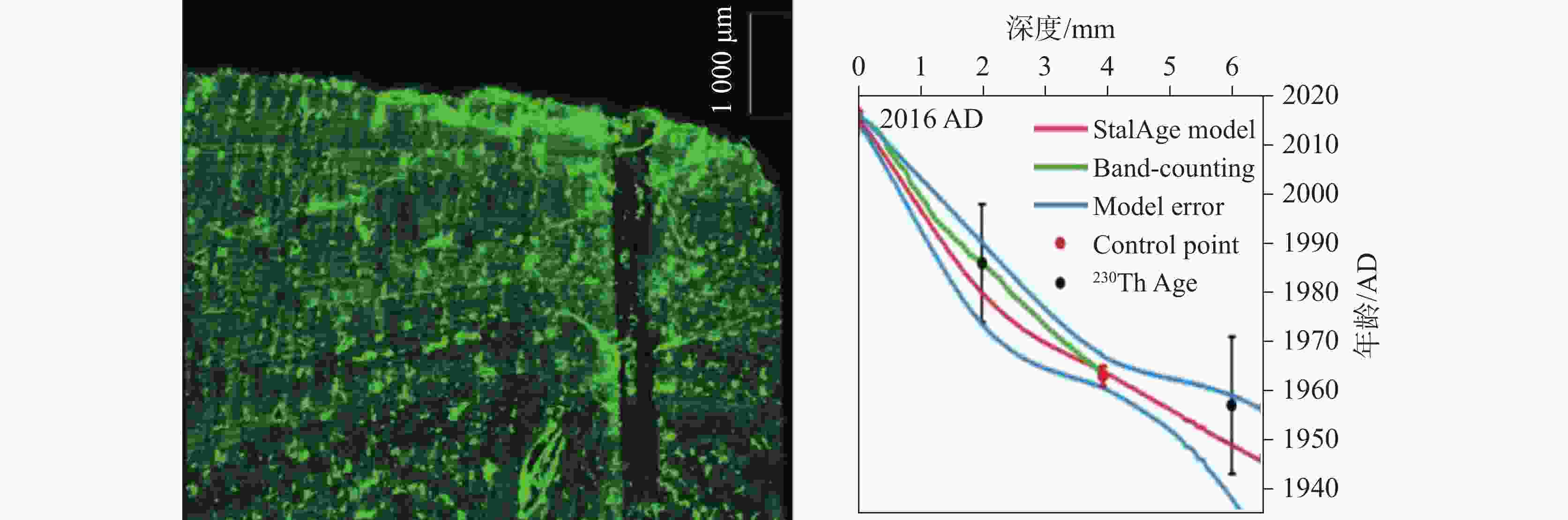 Age (a AD)TK22-1-1 6 1602.7 ±4.06707 ±1358±0 79.7±2.6 0.0019 ±0.0001 80±3 1935±81 TK22-1-1 11 1496.2 ±3.2931±39 19±2 82.5±2.2 0.0015 ±0.0002 82±2 1904±31 TK22-1-2 17 1691.3 ±3.9051±42 25±2 83.1±2.2 0.0019 ±0.0002 83±2 1861±29 *Th衰变常数为λ230=9. 1705 ×10−6a−1,U衰变常数为λ234=2.82206 ×10−6 a−1,λ238=1.55125 ×10−10 a−1;δ 234U = ([234U/238U]activity−1)×1000 。 根据230Th年龄获得δ234U初始值=δ234U测量值×eλ234×T。初始年龄校正采用230Th /232Th平均比值:4.4±2.2×10−6。 -