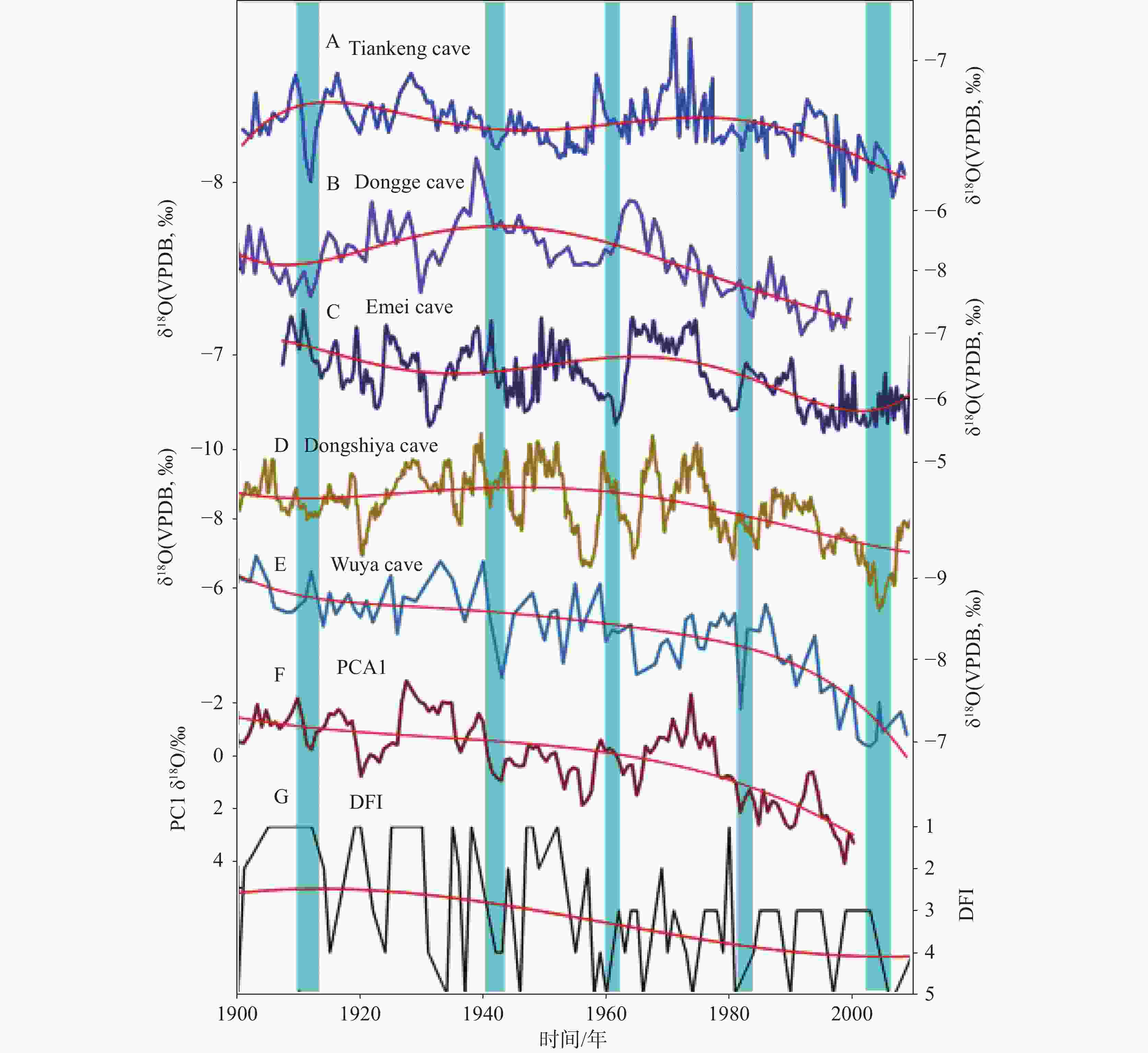 (A) 天坑洞石笋TK22-1(本文) (B) 董哥洞石笋DX2[24] (C) 峨眉洞石笋EM1[16] (D) 东石崖洞石笋DSY1201[25] (E) 乌鸦洞石笋WY33[26] (F) 对TK22-1、DX2、EM1、DSY1201和WY33的主成分分析(PCA)结果 (G) 渝东南近100年旱涝指数(旱涝指数越大代表干旱程度越强)[33],图中红色曲线为多项式拟合曲线,指示变化趋势;蓝色条带指示研究区发生的干旱事件