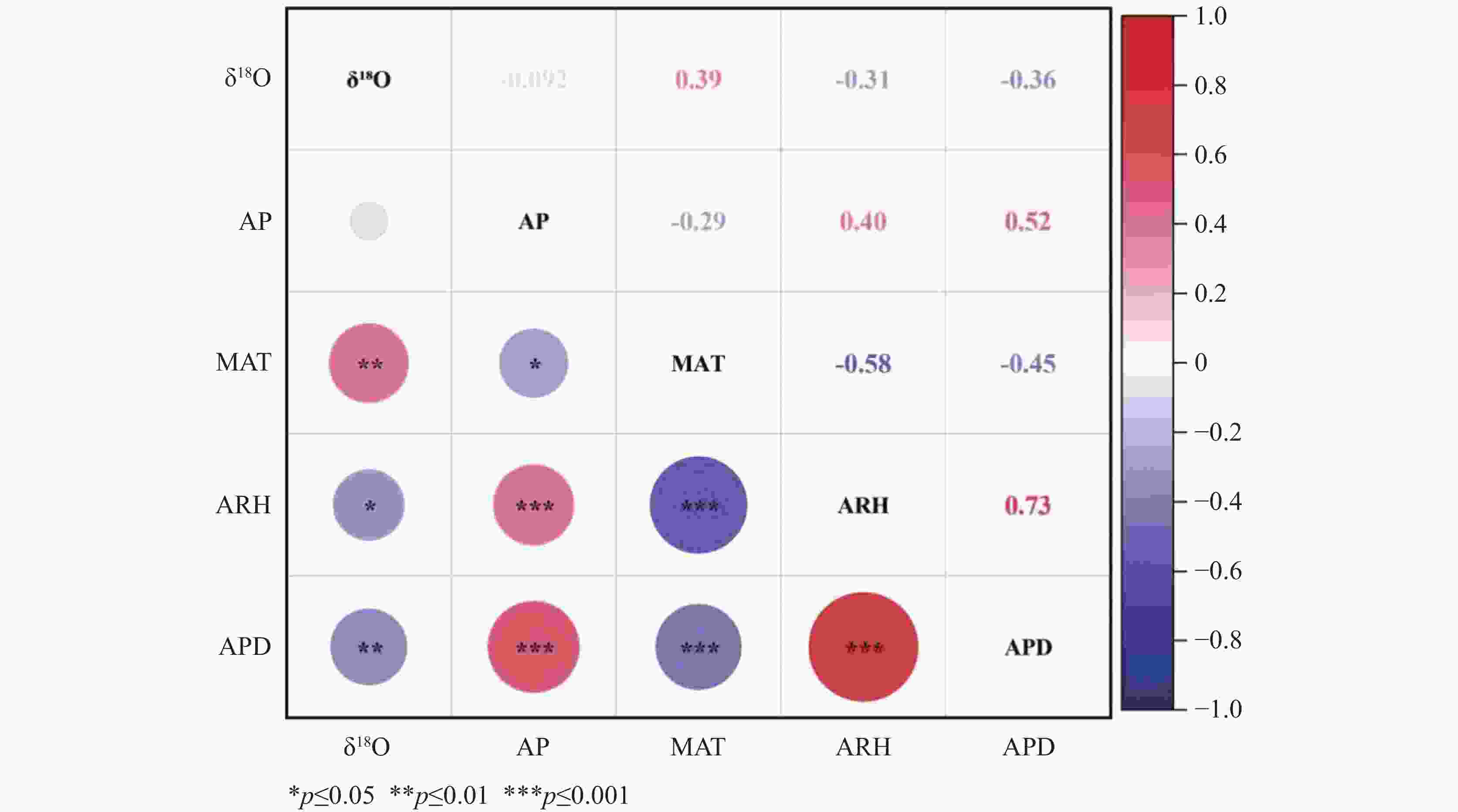 图 6 TK22-1石笋 δ18O、年降水量(annual precipitation, AP)、年平均气温(Mean Annual Temperature, MAT)、年相对湿度(Annual Relative Humidity, ARH)和年降水日数(Annual Precipitation Days, APD)相关性图