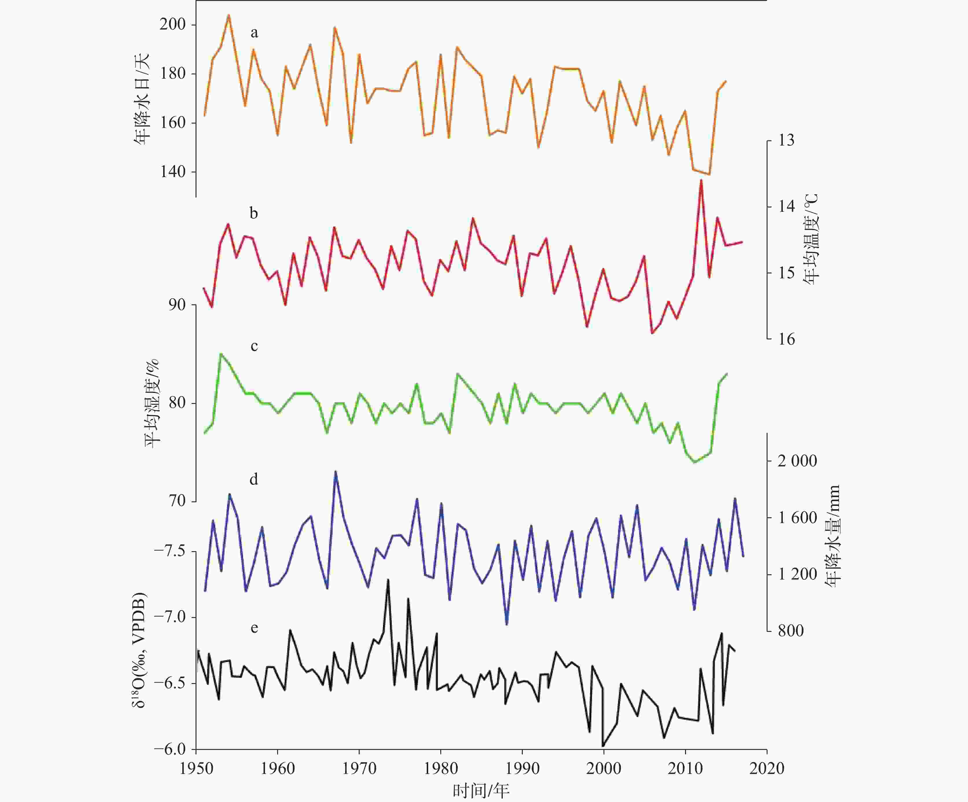 Figure 7. Comparison between the oxygen isotope sequence of stalagmite TK22-1 and the instrumental meteorological data in Youyang area from 1950 to 2016