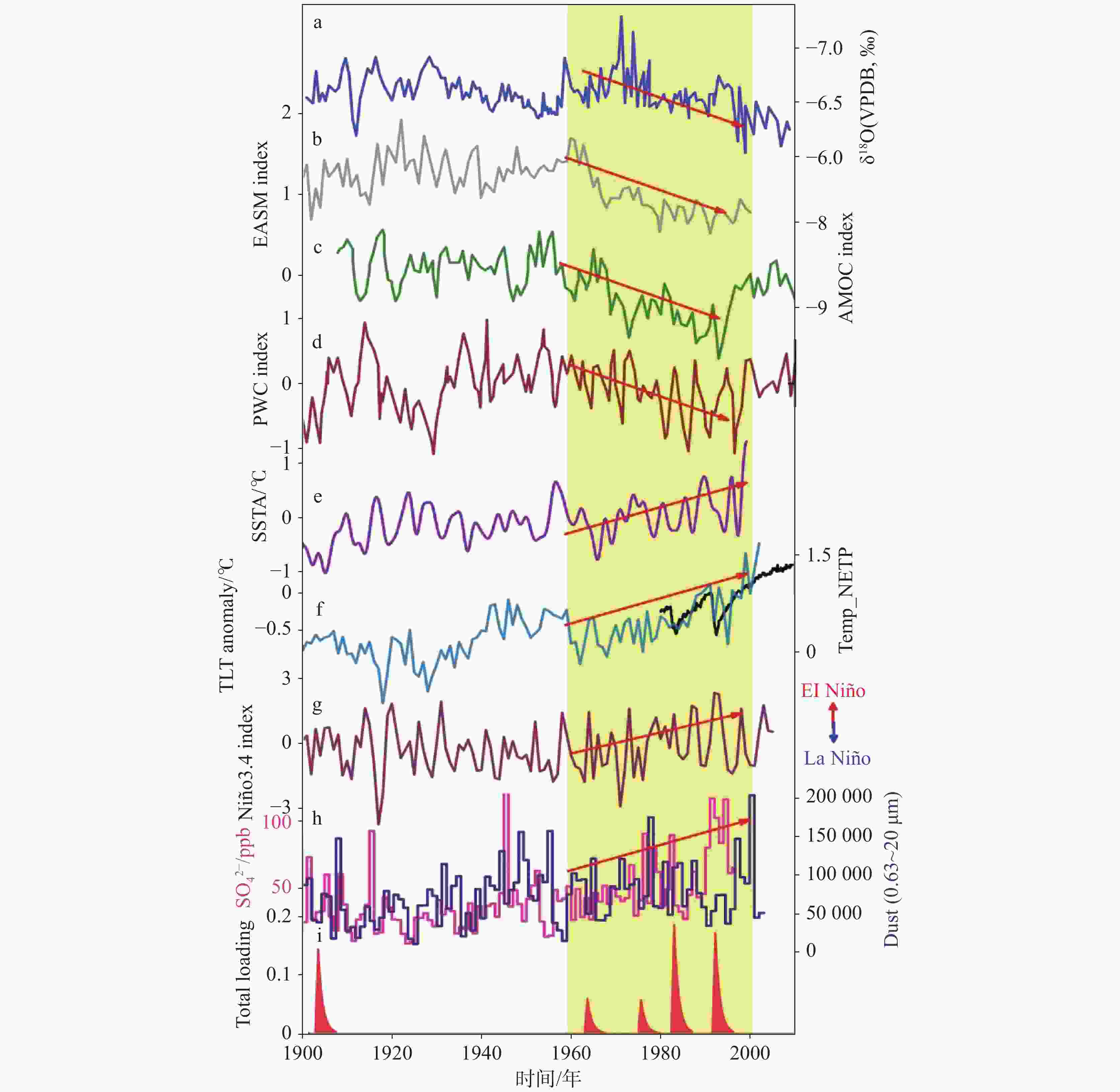 (A)天坑洞石笋 TK22-1 δ18O记录(本文) (B) 东亚夏季风重建指数[41] (C)AMOC重建指数[42] (D) 太平洋沃克环流指数[43] (E)SST重建指数[44] (F)青藏高原东北部温度重建记录(浅蓝)[45],对流层温度重建(黑色)[46] (G)Niño3 区海表温度距平值[47] (H)达索普冰芯${\rm{SO}}_4^{2-} $(粉色)和灰尘粒子记录(紫色)[48] (I)火山气溶胶总负荷量(0~30°N)[49],图中黄色区域指示季风快速减弱发生时期