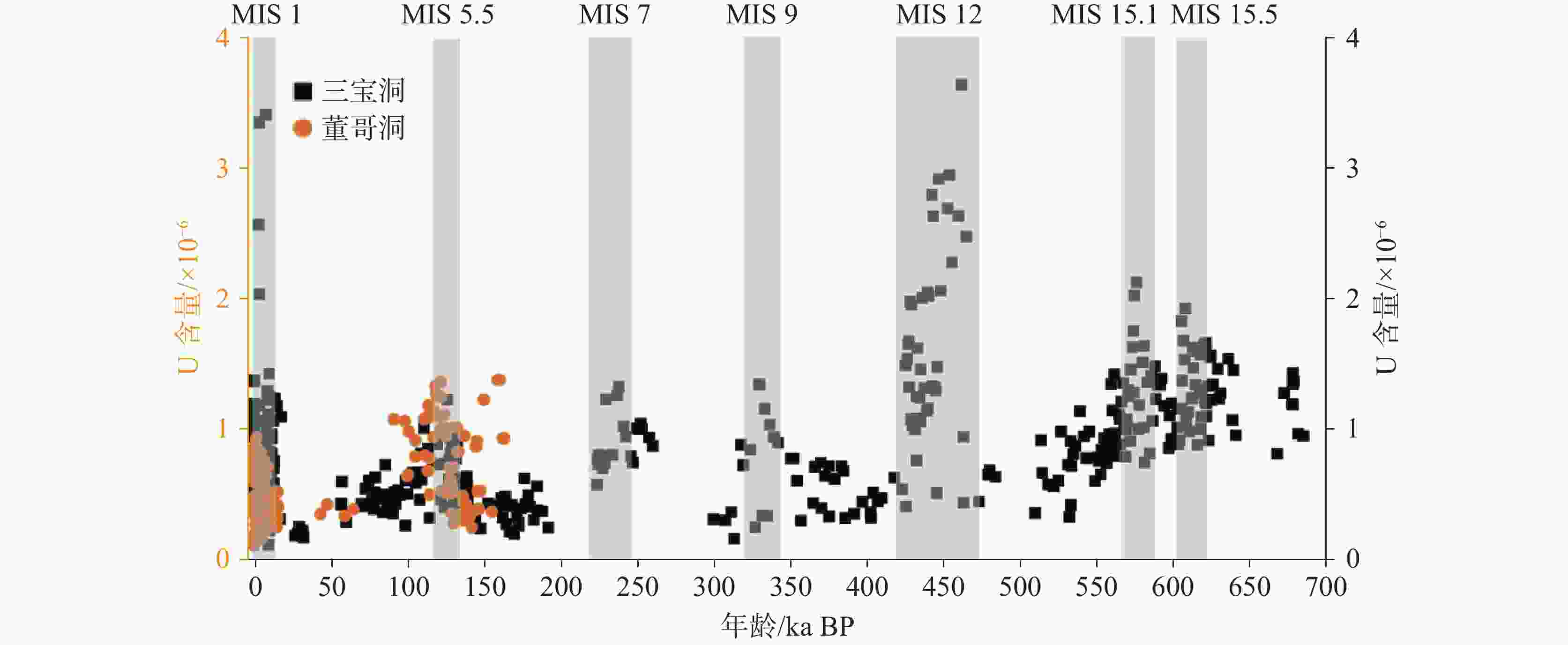 石笋采样洞穴 经度 纬度 U含量/×10−6 地层 矿物相 岩性 北京苦栗树 115.650 39.683 0.454 元古界 方解石 次纯碳酸岩盐 北京石花洞 115.642 39.985 0.285 奥陶 方解石 白云岩 云南乃古石林区 103.436 24.761 0.033 二叠 方解石 灰岩 云南小白龙洞 103.350 24.200 0.642 三叠 方解石 灰岩–白云岩 云南葫芦洞 101.167 26.533 0.294 元古界 方解石 次纯碳酸盐岩层 云南仙人洞 103.500 25.849 0.188 二叠 方解石 灰岩 云南赤土仙人洞 99.633 27.767 0.663 三叠 方解石 灰岩 云南省司岗里洞 99.549 23.533 0.203 二叠 方解石 灰岩 云南宜良九乡蝙蝠洞 103.053 24.610 4.727 元古界 文石 灰岩–白云岩 云南硝洞 104.933 26.033 2.043 石炭 方解石 灰岩 辽宁暖和洞 124.933 41.317 0.120 石炭 方解石 不纯碳酸盐岩层 辽宁本溪水洞 124.071 41.297 0.182 奥陶 方解石 灰岩 辽宁庙洞 125.300 41.092 0.185 寒武 方解石 灰岩 辽宁王家葳洞 124.383 41.217 0.105 侏罗 方解石 灰岩 山东临沂地下画廊 118.417 35.683 13.397 寒武 方解石 灰岩 山东开元洞 118.034 36.406 0.364 奥陶 方解石 灰岩 山东黄巢洞 118.333 36.617 0.398 奥陶 方解石 灰岩 山东上小峰洞 118.017 36.350 0.374 奥陶 方解石 灰岩 福建玉华洞 117.533 26.767 0.463 侏罗 方解石 灰岩 福建仙云洞 117.266 25.561 18.777 二叠 方解石 灰岩 贵州董哥洞 108.082 25.033 0.621 石炭 方解石 灰岩 贵州三星洞 107.183 27.367 2.231 二叠 方解石 白云岩 贵州石膏洞 107.208 28.200 1.073 寒武 方解石 白云岩 贵州雾露洞 105.089 26.067 2.624 三叠 方解石 灰岩 贵州衙门洞 107.900 25.483 0.074 石炭 方解石 灰岩 贵州黑洞 106.167 27.200 0.652 三叠 方解石 灰岩 贵州竹磂坪洞 104.958 26.017 0.107 石炭 方解石 灰岩 贵州水西洞 106.398 27.061 0.791 三叠 方解石 灰岩 贵州七星洞 107.251 25.983 1.831 石炭 方解石 灰岩 贵州石将军洞 106.065 26.284 14.690 三叠 方解石 白云岩 贵州白骨洞 106.495 26.224 0.140 泥盆 方解石 灰岩 贵州山王洞 107.300 28.233 7.294 奥陶 方解石 白云岩 贵州郑家洞 106.030 26.279 0.430 三叠 文石-方解石 白云岩 贵州道观洞 105.090 26.064 0.044 三叠 方解石 灰岩 贵州夜郎洞 105.736 26.041 0.030 三叠 方解石 灰岩–白云岩 贵州龙泉洞 107.914 25.483 0.205 二叠 方解石 灰岩 贵州飞龙洞 104.882 24.970 0.171 三叠 方解石 灰岩–白云岩 贵州Poya洞 108.967 27.883 0.327 寒武 方解石 白云岩 贵州红岩洞 109.150 28.100 0.139 寒武 方解石 白云岩 贵州织金洞 105.683 26.661 0.018 三叠 方解石 灰岩 江苏宜兴茗岭洞 119.700 31.183 0.052 志留 方解石 灰岩 青藏高原东部黄龙洞 103.817 32.717 0.190 三叠 方解石 灰岩 陕西佛爷洞 109.167 33.567 0.569 奥陶 方解石 灰岩 陕西九仙洞 109.100 33.567 0.379 奥陶 方解石 不纯碳酸盐岩层 陕西大鱼洞 106.321 33.099 16.913 二叠 文石 不纯碳酸盐岩层 陕西祥龙洞 106.328 32.948 0.179 寒武 方解石 次纯碳酸盐岩层 陕西汉中地洞河溶洞 106.540 32.679 1.146 二叠 方解石 次纯碳酸盐岩层 陕西白云洞 113.467 36.633 0.753 奥陶 方解石 灰岩–白云岩 山西龙洞 113.342 38.700 0.808 奥陶 方解石 白云岩 山西龙凤洞 113.550 38.680 0.114 奥陶 方解石 灰岩 山西莲花洞 113.717 38.167 0.218 奥陶 方解石 白云岩 湖北神农架三宝洞 110.433 31.667 0.732 元古界 方解石 白云岩 湖北神农架永兴洞 111.233 31.567 0.627 志留 方解石 灰岩 湖北神农架青天洞 110.367 31.500 1.755 元古界 方解石 次纯碳酸盐岩层 湖北豪猪洞 109.983 30.683 0.144 三叠 方解石 灰岩 湖北落水洞 109.101 29.717 1.431 二叠 方解石 灰岩 湖北大石包洞 105.050 26.083 0.323 二叠 方解石 不纯碳酸盐岩层 湖北牛洞 110.267 31.700 0.793 志留 方解石 灰岩-白云岩 湖北天鹅洞 110.633 31.700 0.230 元古界 方解石 灰岩 湖北犀牛洞 110.420 31.679 1.491 寒武 方解石 灰岩 湖北黑龙洞 110.433 31.667 7.985 元古界 方解石 白云岩 湖北林渚洞 110.317 31.517 0.298 元古界 方解石 次纯碳酸盐岩层 湖北龙腑宫洞 110.775 31.692 5.798 元古界 方解石 灰岩 湖北海落洞 109.983 30.753 2.763 二叠 方解石 灰岩 湖北和尚洞 110.419 30.446 0.650 寒武 方解石 灰岩–白云岩 湖北黄龙洞 110.218 33.134 0.184 元古界 方解石 灰岩 甘肃武都万象洞 105.000 33.283 3.590 石炭 方解石 类型不明的碳酸盐岩层 甘肃乌鸦洞 105.426 33.821 0.458 泥盆 方解石 类型不明的碳酸盐岩层 甘肃黄爷洞 105.117 33.603 0.537 石炭 方解石 灰岩 西藏昌都崩勒溶洞 96.515 31.218 0.126 三叠 方解石 灰岩 西藏天门洞 90.033 30.875 0.385 二叠 方解石 灰岩 西藏香格里拉市石卡雪山高原 99.594 27.803 0.382 石炭 方解石 灰岩 重庆新崖洞 109.467 30.750 0.126 三叠 方解石 灰岩 重庆水鸣洞 107.833 29.750 1.118 三叠 方解石 灰岩 重庆羊子洞 107.375 29.267 0.186 三叠 方解石 灰岩 重庆羊口洞 107.183 29.033 7.405 二叠 方解石 白云岩 重庆芙蓉洞 107.900 29.217 2.236 寒武 文石 灰岩 重庆金佛洞 107.183 29.033 19.110 二叠 方解石 白云岩 重庆粱天湾洞 107.033 28.833 12.469 二叠 方解石 灰岩 重庆黑风洞 117.517 26.750 4.407 二叠 方解石 灰岩 重庆天坑洞 108.776 28.735 1.597 奥陶 方解石 灰岩 重庆XSY洞 108.369 29.707 0.130 三叠 方解石 灰岩 河南老母洞 111.567 33.767 0.805 白垩 方解石 灰岩 河南马沟洞 113.383 34.317 0.366 奥陶 方解石 灰岩 河南东石崖洞 111.567 33.783 0.158 元古界 方解石 灰岩 河南伏牛山南坡南阳洞 111.533 33.433 0.915 元古界 方解石 大理岩 四川诺水河溶洞群 107.167 32.425 0.372 二叠 方解石 灰岩 四川仙人洞 107.167 32.422 0.180 二叠 方解石 灰岩 四川神奇洞 103.100 28.933 5