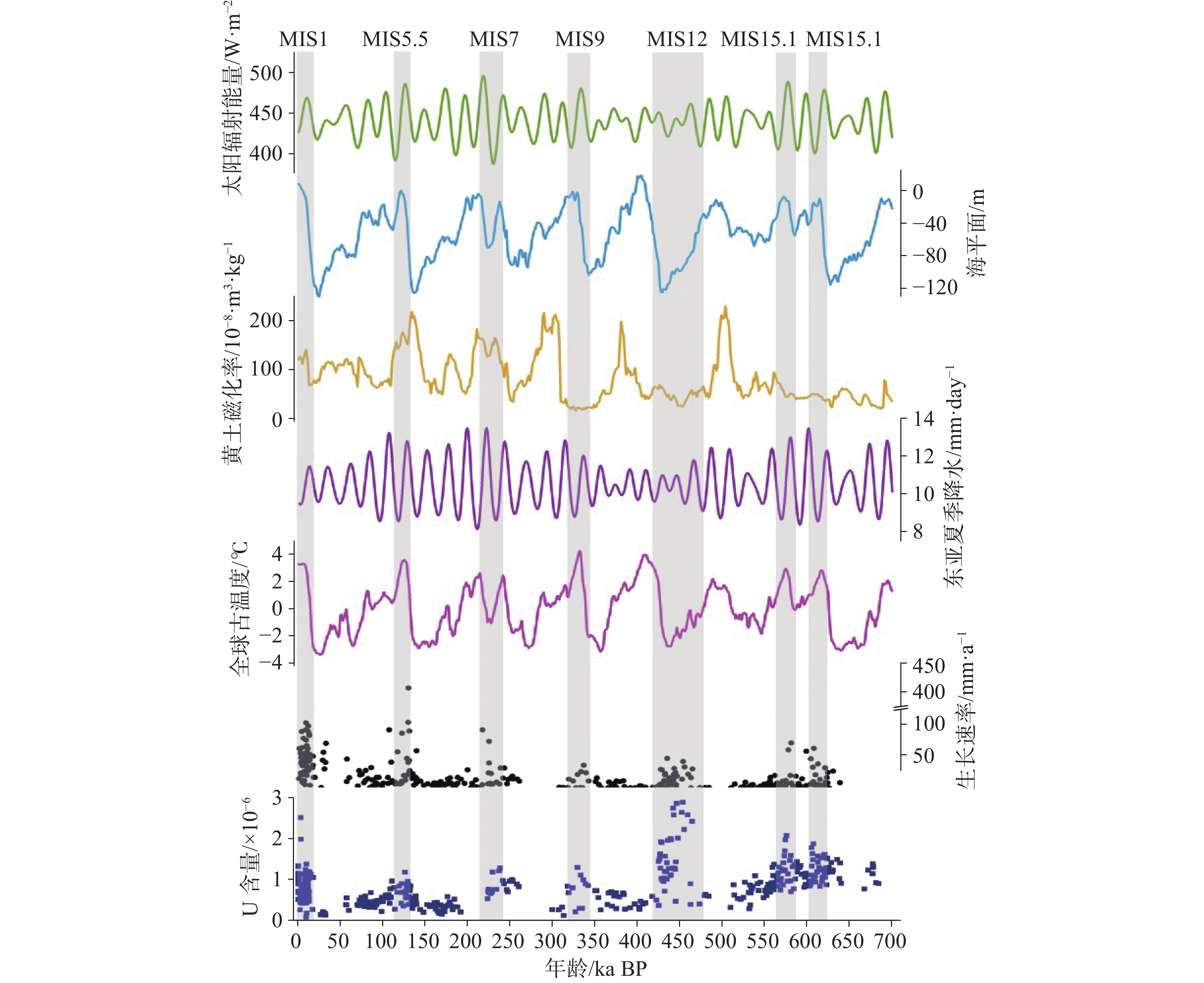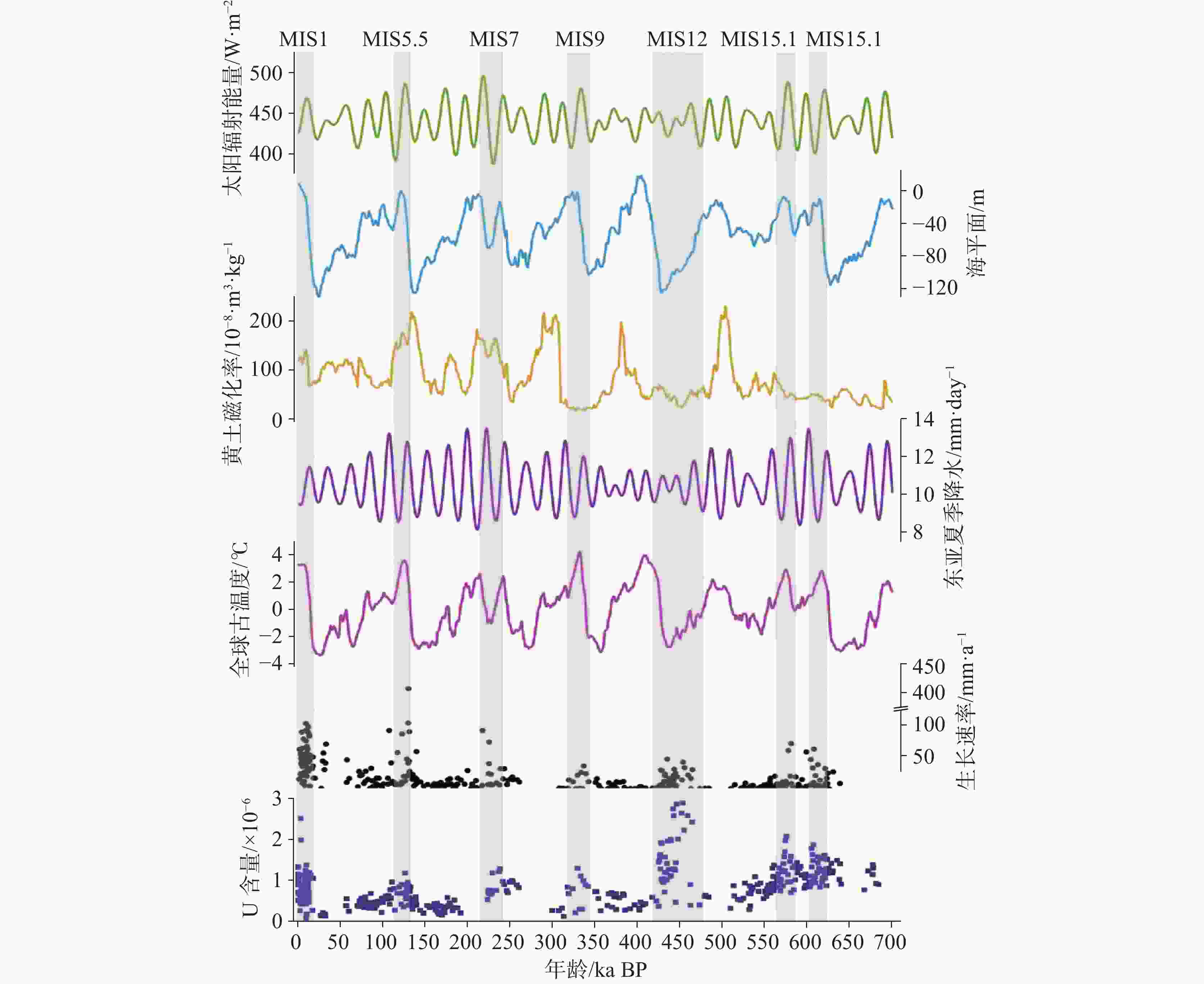 图 4 北半球夏季太阳辐射[88](a),海平面[89](b),靖远黄土磁化率[90](c),东亚夏季降水[91](d),全球古温度[92](e),湖北三宝洞石笋平均生长速率[83,93](f)与湖北三宝洞石笋铀含量[3,9,14−26](g)