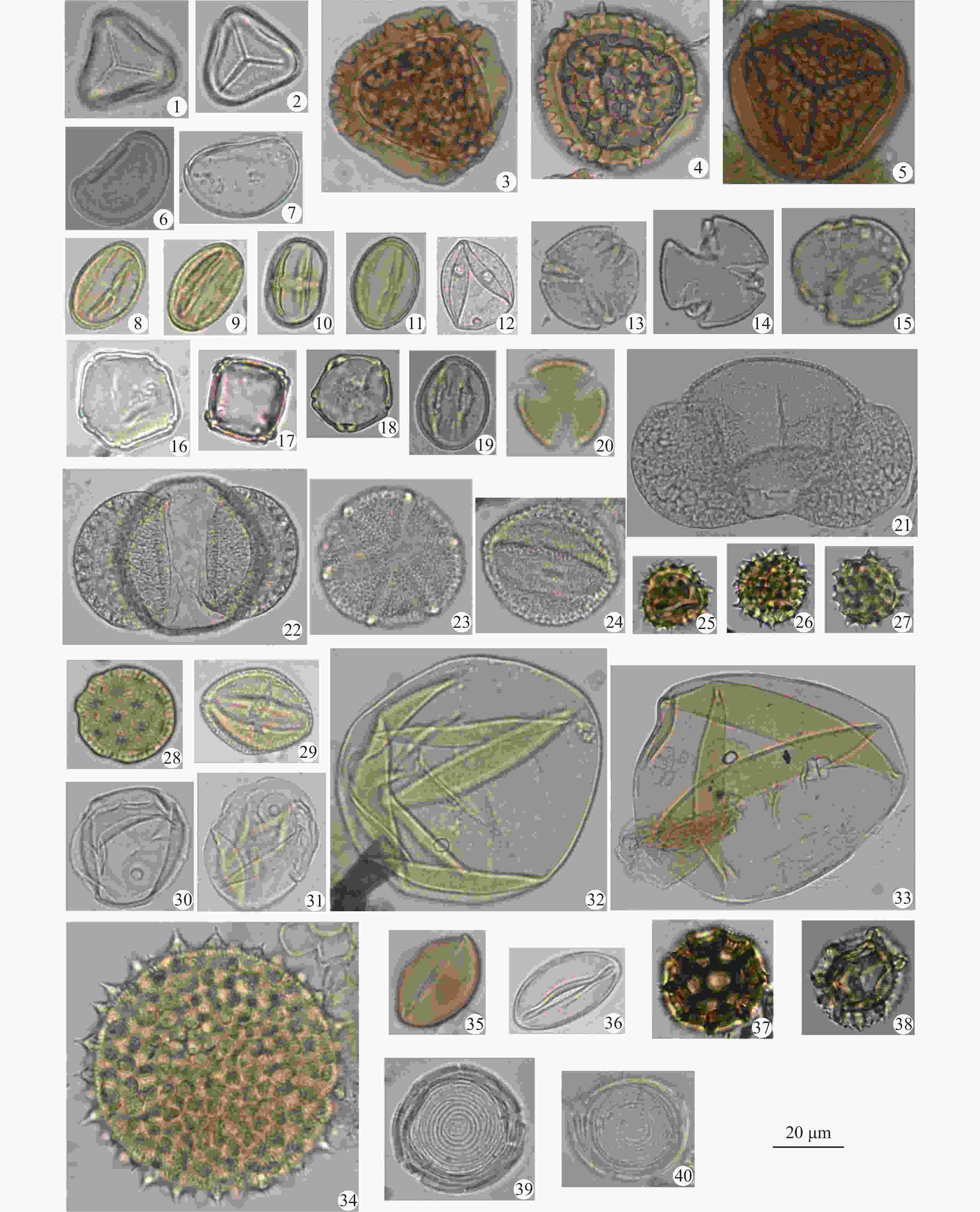 1-2.芒萁属 3-5.凤尾蕨属 6-7.肾蕨属 8-11.栗属 12.桑科 13-15.山麻秆属 16-18.桤木属 19-20.大戟科 21-22.松属 23-24.云实属 25-27.菊科 28.藜科 29.蓼科 30-31.禾本科 32-33.玉蜀黍属 34.旋花科 35-36.石蒜科 37-38.蒲公英属 39-40.环纹藻