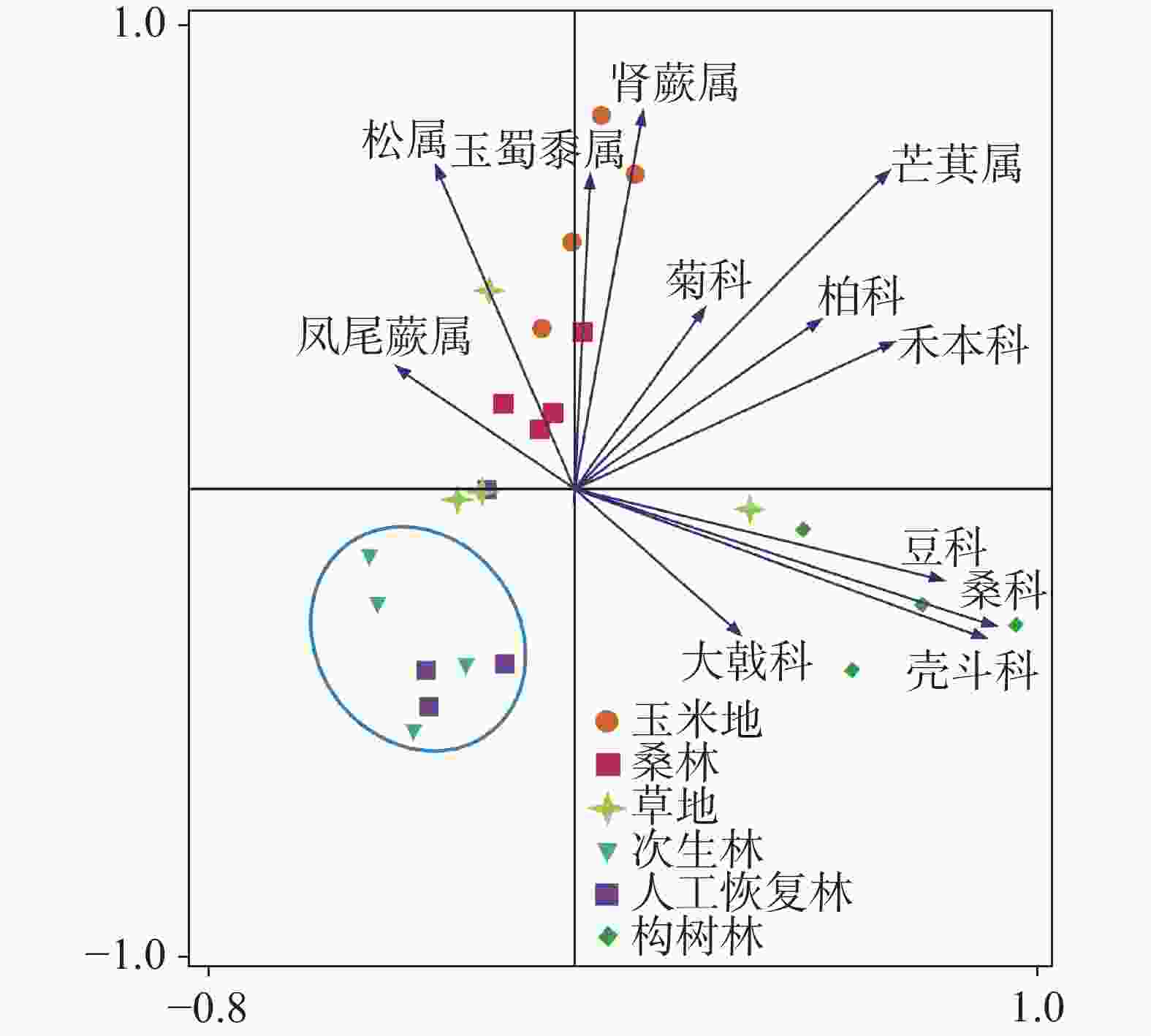 摘要: 厘清喀斯特地区表土孢粉与现代植被的关系是解译地层孢粉的基础,是恢复古环境的前提。文章通过分析广西环江喀斯特观测站的24个表土和苔藓样品,探讨其表土孢粉与现代植被的对应关系。结果表明:(1)共鉴定出49科/属孢粉类型,花粉组合中针叶类占优势,含量为32.49%~78.65%,其中以松属为主;其次为草本(9.41%~53.43%),以禾本科、菊科和玉蜀黍属为主;阔叶乔灌木类最低,含量为2.94%~33.49%,以豆科、大戟科、木兰科和桑科为主。表土花粉组合基本能反映环江站周围植被的总体特征;(2)草本花粉在玉米地含量最高(53.43%),主要以玉蜀黍属为主;次生林、草地、人工恢复林及桑林的蕨类孢子含量较高,分别达53.91%、49.00%、48.88%和46.04%;(3)主成分分析可较好区分草地、人工恢复林、构树林、次生林和玉米地,但桑林并不能很好地被区分,可能与采样时间及其花粉保存条件等有关;(4)孢粉浓度大小依次为人工恢复林>桑林>玉米地>次生林>草地>构树林,这可能与植被组成、土层扰动及孢粉保存条件等有较大关系。Abstract: