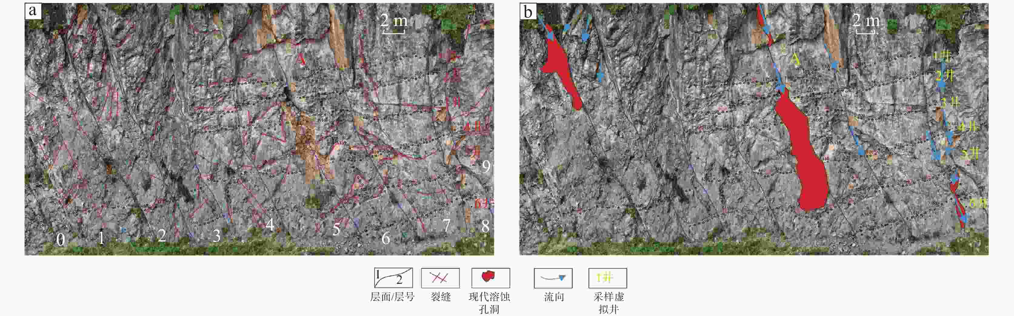 a.模型中裂缝解释,受多期构造影响,至少发育NE、NW、近SN、近EW和斜交5个方向裂缝,裂缝密度2~8条·m−1 b.模型中现代溶洞解释及现今地表水渗流流向推测