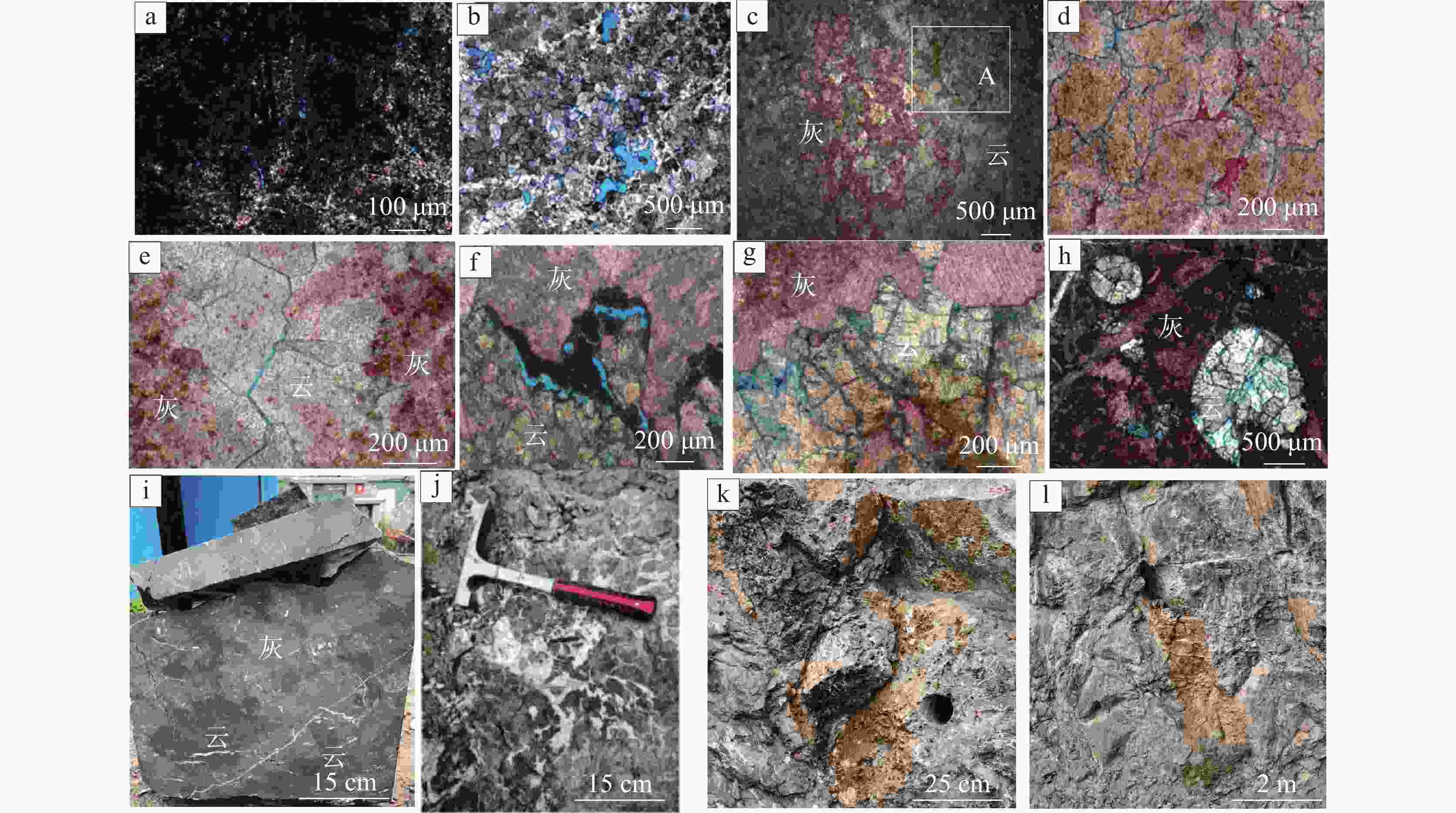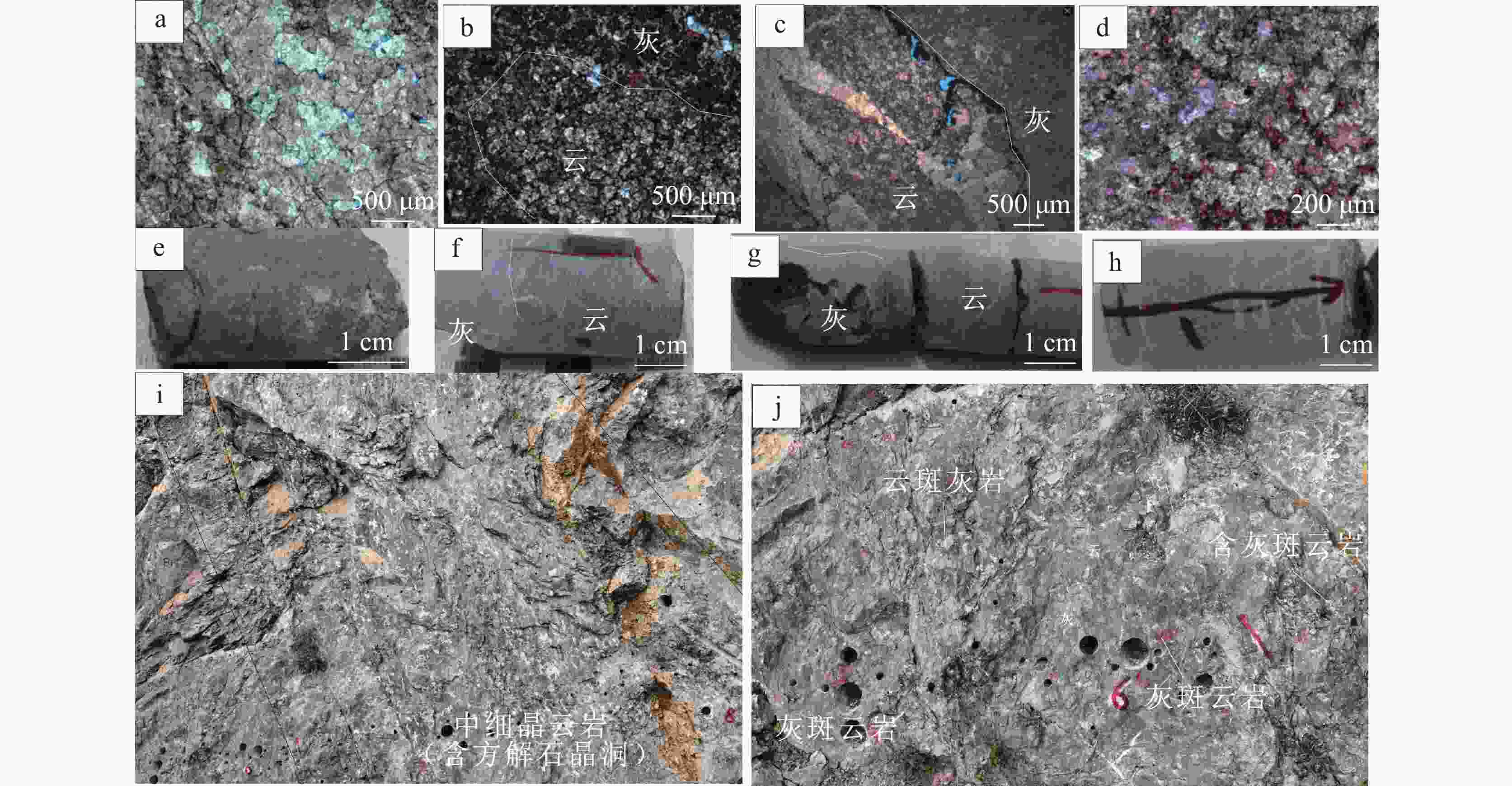 a,e,i.不同尺度表征的中细晶云岩:a.铸体薄片下晶间孔发育,e.岩芯尺度下可见方解石溶孔,i.无人机中尺度模型中云岩层 b,f,j.不同尺度表征的云斑灰岩:b.染色薄片下云斑具有较好晶性,方解石染红色,灰岩与云岩突变接触,f.岩芯尺度下灰岩光滑,云岩粗糙,二者渐变–突变接触,j.无人机中尺度模型中云斑类岩石,野外盐酸和Mg试剂鉴定后用红色油漆区分灰岩和云岩,其中浅灰色部分为灰岩、深灰色为云岩,根据灰岩和云岩相对含量可区分出灰斑云岩、云斑灰岩、含灰斑云岩等 c,g,j.不同尺度表征的灰斑云岩 d,h.不同尺度表征的含云斑灰岩,红色为方解石染色