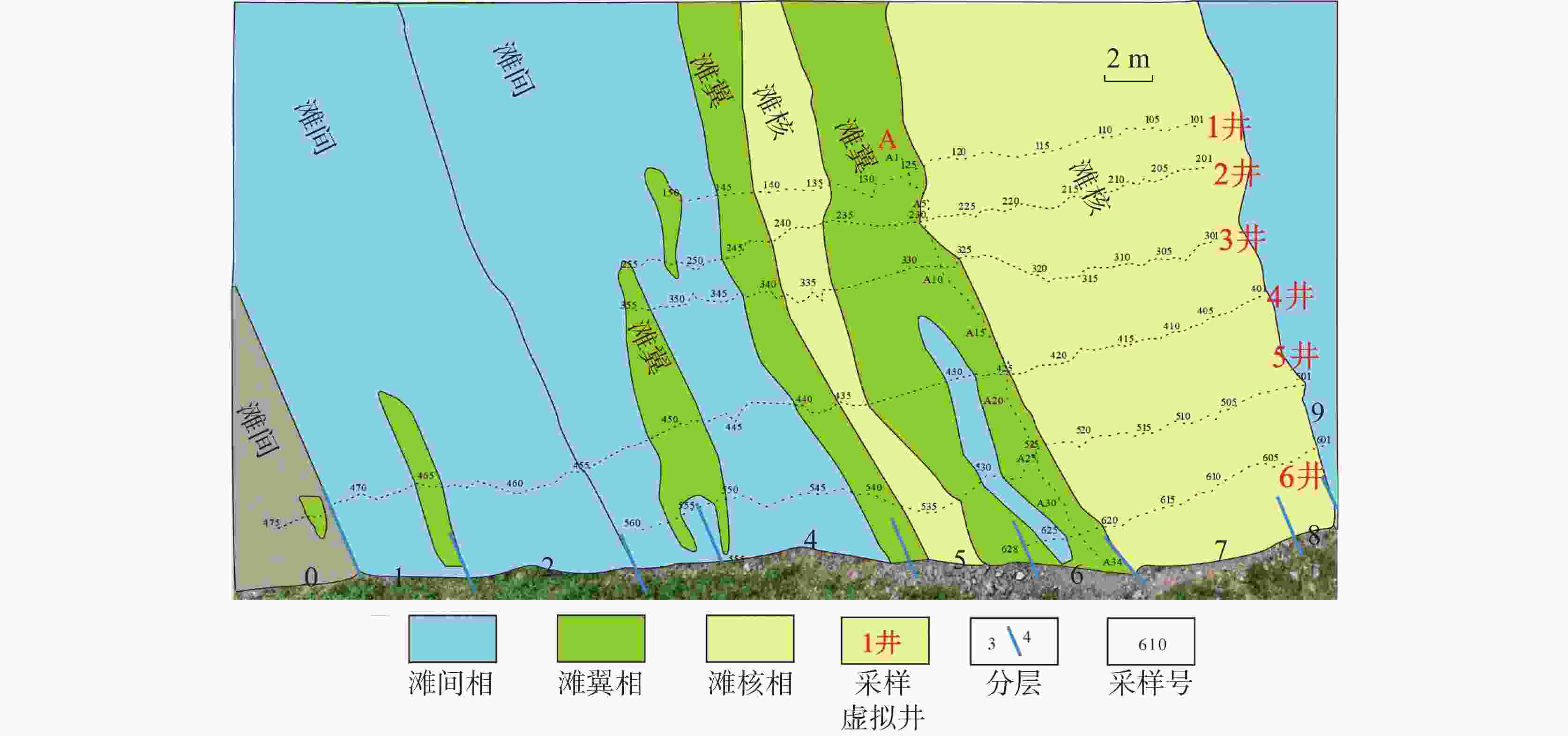 a.储层段虚拟井钻样以及岩相识别 b.无人机倾斜测量模型中云斑地质解释注:1~6井为采样虚拟井,基本垂直层面展布;A井为顺云斑段采样,101~155为1井采样号,采集55个样间距0.3 m。