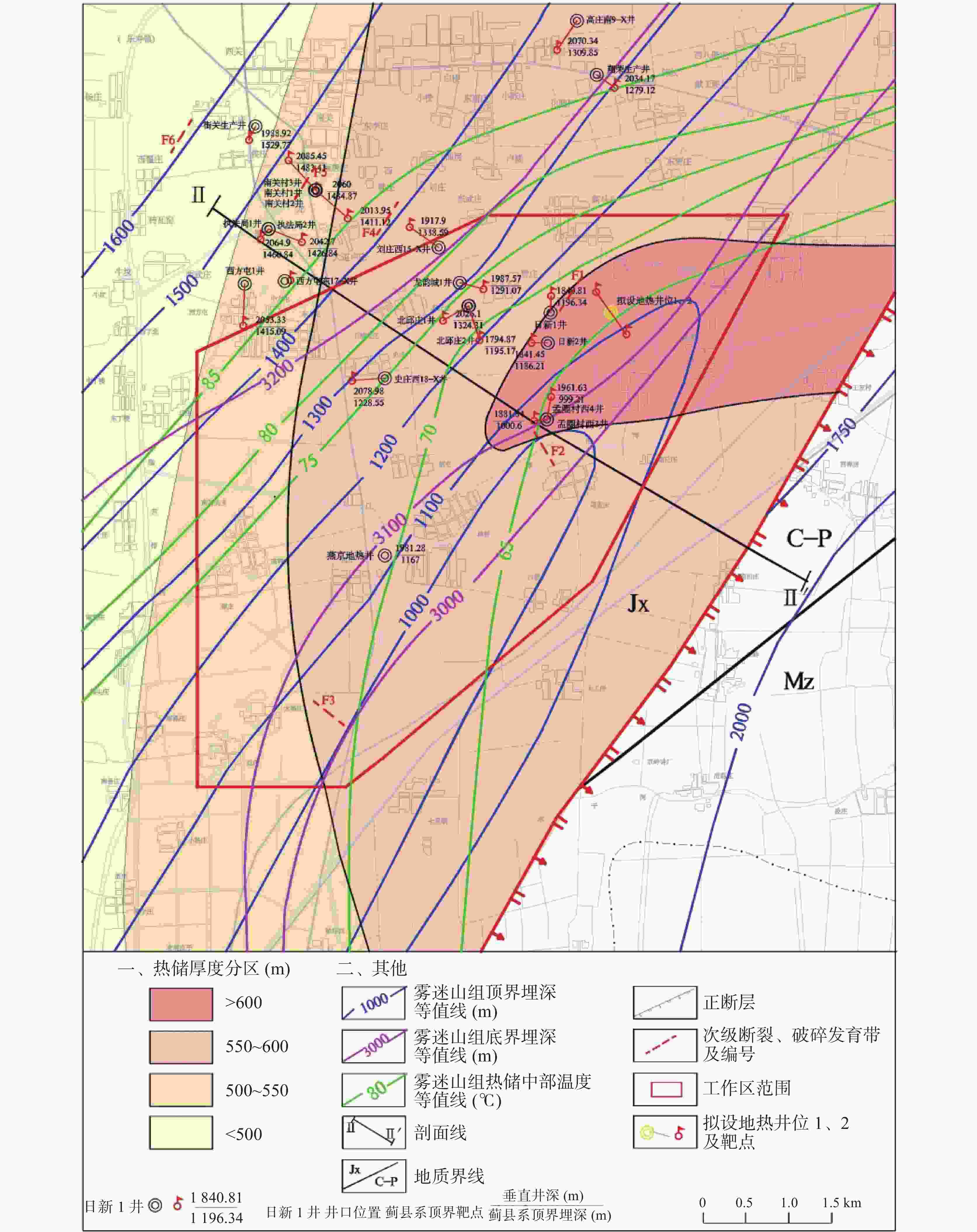 4000 m以浅地层自上而下涵盖新生界、中生界、古生界及中上元古界。野外工作中,大地电磁法测深布设5条剖面(总长28.67 km,60个测点),采用V8电法仪记录正交电磁场分量,通过一维(Bostick)、二维(RRI、Occam)等多方法反演获取电性结构;微动探测布设1条剖面(长8.54 km,19个测点),利用EPS-D10宽频地震仪提取瑞雷波频散曲线,反演地下横波速度结构,两种方法相互约束以降低物探多解性。结果表明:一是识别出6条次级断裂及破碎发育带,主要分布于研究区西北部,断裂带附近裂隙发育,为地热流体运移提供通道,可作为重点钻探靶区;二是明确主要地层顶底板埋深,新生界第四系底界埋深415~471 m、新近系底界980~1420 m,中上元古界蓟县系雾迷山组顶界埋深980~1430 m,且地层呈现“西北埋藏深、东南埋藏浅”的分布特征;三是揭示地温梯度规律,新生界、中生界增温率最大(新生界地温梯度3.5~4.0 ℃·(100 m)-1),进入基底中上元古界后增温放缓,基岩地温梯度1~1.5 ℃·(100 m)-1,蓟县系雾迷山组热储中部温度70~80 ℃,西北向东南逐渐降低;四是圈定适宜与较适宜地热开采区,中上元古界蓟县系岩溶裂隙热储全区分布,热储厚度500~600 m,涌水量57~140.19 m3·h-1,单位涌水量0.266~8.67 m3·(h·m)-1。通过钻凿献县东南探采1井(井深2508 m,水温70 ℃,水量100 m3·h-1)验证,物探解译的地层层序、埋深与实钻数据吻合度高。研究证实,大地电磁测深法与微动探测法的联合应用可有效刻画地热地质结构,成果可为献县地热资源科学开发及区域“双碳”目标实现提供技术支撑。Abstract: Xianxian County is recognized as "the largest geothermal enrichment area in North China," boasting abundant medium- and low-temperature geothermal resources. To address the insufficient understanding of deep geothermal resource distribution and heat-controlling structure development in the southeastern block of Xianxian County, and to support the large-scale development of bedrock fracture-type thermal reservoirs, this study employed an integrated geophysical exploration approach combining the Magnetotelluric (MT) method and microtremor survey. It conducted exploration and interpretation of stratigraphic, fault, and thermal reservoir characteristics in the study area, with the reliability of results verified using drilling data.The study area is situated in the northern part of the Xianxian Uplift, Cangxian Uplift, Bohai Bay Basin. Within the depth of4000 m, the strata from top to bottom include the Cenozoic, Mesozoic, Paleozoic, and Middle-Upper Proterozoic Erathems. For fieldwork, 5 MT profiles (total length: 28.67 km; measurement points: 60) were deployed. A V8 electrical instrument recorded orthogonal electromagnetic field components, and electrical structures were derived via multi-method inversion (1D Bostick, 2D RRI, 2D Occam). For microtremor surveys, 1 profile (length: 8.54 km; measurement points: 19) was laid out. An EPS-D10 broadband seismograph extracted Rayleigh wave dispersion curves to invert the underground shear wave velocity structure, and the two methods constrained each other to reduce geophysical non-uniqueness.Results show: (1) 6 secondary faults and fractured zones were identified, mainly distributed in the northwest of the study area. Well-developed fractures around fault zones provide channels for geothermal fluid migration, serving as key drilling targets. (2) Burial depths of the top/bottom boundaries of major strata were clarified: Quaternary System (Cenozoic) bottom boundary: 415−471 m; Neogene System bottom boundary: 980−1420 m; Wumishan Formation (Jixian System, Middle-Upper Proterozoic) top boundary: 980−1430 m. Strata exhibit a "deeper burial in the northwest, shallower in the southeast" pattern. (3) Geothermal gradient laws were revealed: the highest heating rate occurs in the Cenozoic and Mesozoic (Cenozoic geothermal gradient: 3.5−4.0 ℃/100 m); after entering the Middle-Upper Proterozoic basement, the heating rate slows down (bedrock geothermal gradient: 1−1.5 ℃/100 m); the temperature in the middle of the Wumishan Formation thermal reservoir is 70−80 ℃, decreasing gradually from northwest to southeast. (4) Suitable and relatively suitable geothermal mining areas were delineated. Karst-fracture thermal reservoirs of the Jixian System (Middle-Upper Proterozoic) are distributed throughout the area, with thermal reservoir thickness: 500−600 m, water inflow: 57−140.19 m3/h, and specific water inflow: 0.266−8.67 m3/(h·m).Verification via Exploration-Production Well 1 in southeastern Xianxian County (well depth:2508 m; water temperature: 70 ℃; water inflow: 100 m3/h) shows high consistency between geophysically interpreted stratigraphic sequences/burial depths and actual drilling data. This study confirms that the combined application of MT and microtremor methods effectively characterizes geothermal geological structures, providing technical support for the scientific development of Xianxian's geothermal resources and the achievement of regional "dual carbon" goals. -
