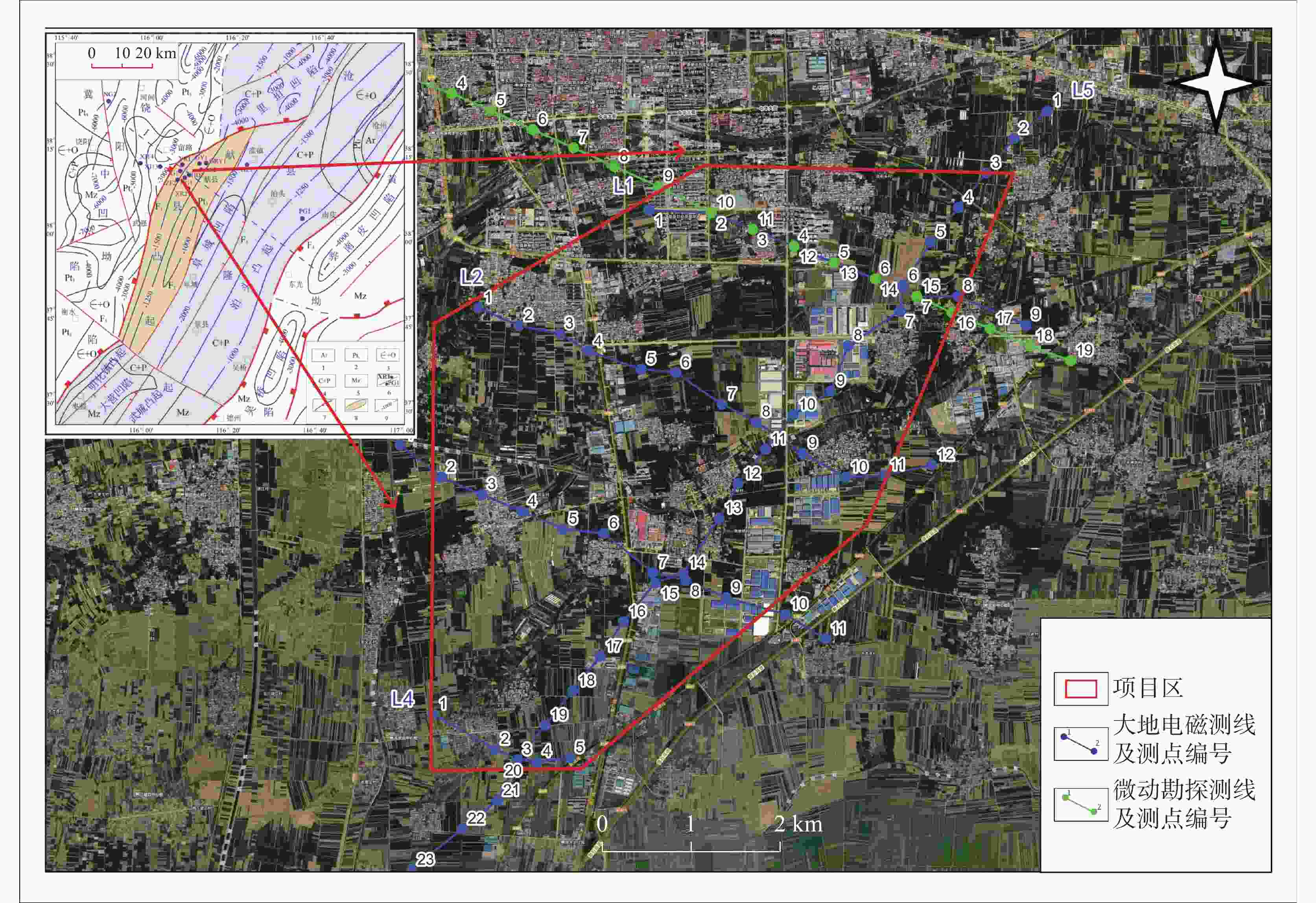 摘要: 献县被誉为“华北地区最大的地热富集区”,中低温地热资源丰富。为解决献县东南区块深部地热资源分布及控热构造发育认识不足的问题,支撑基岩裂隙型热储规模化开发,本文采用大地电磁测深法(MT)与微动探测法相结合的综合物探技术,对研究区地层、断裂及热储特征展开勘查与解译,并结合钻探数据验证成果可靠性。研究区位于渤海湾盆地沧县隆起-献县凸起北部,