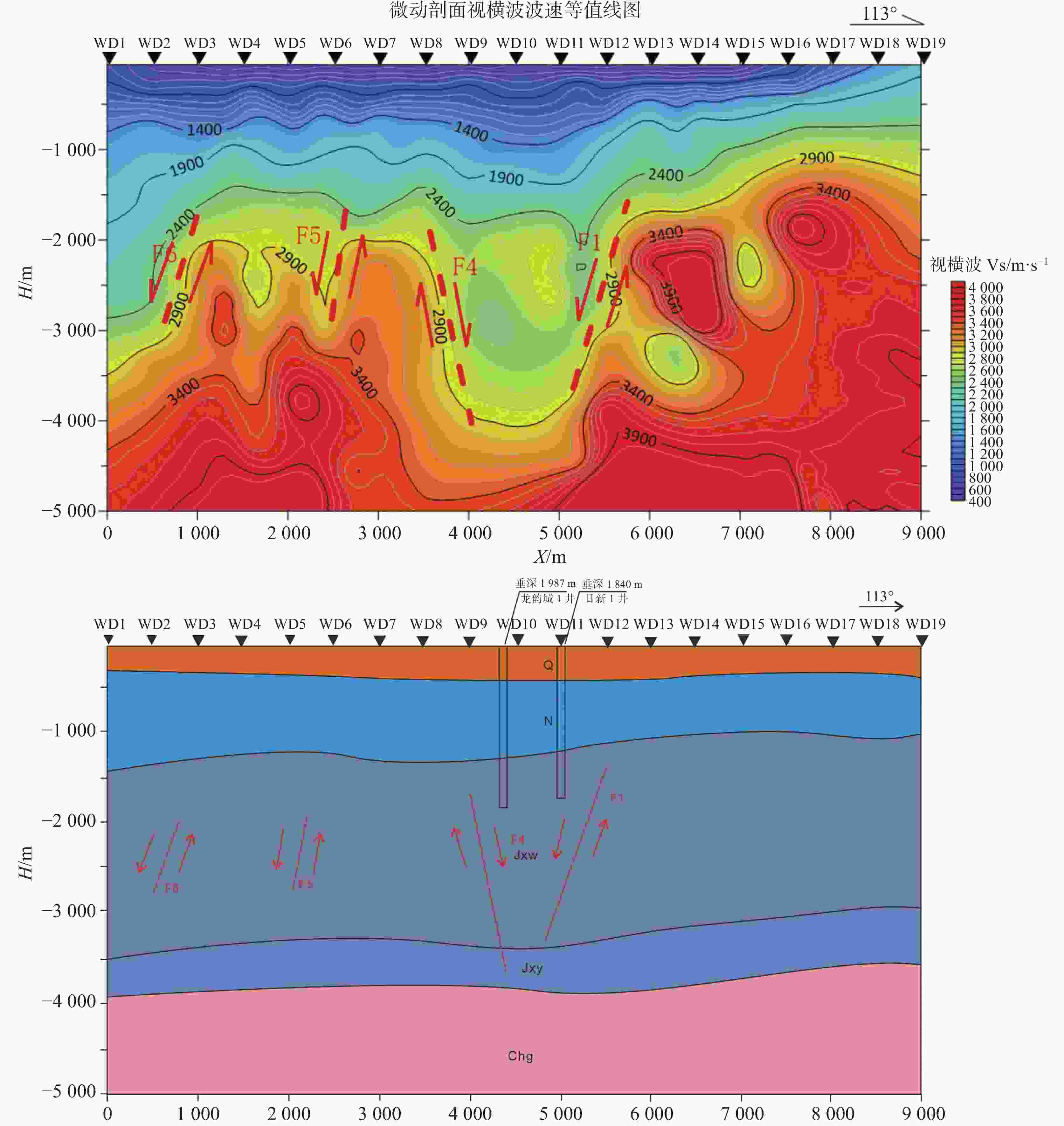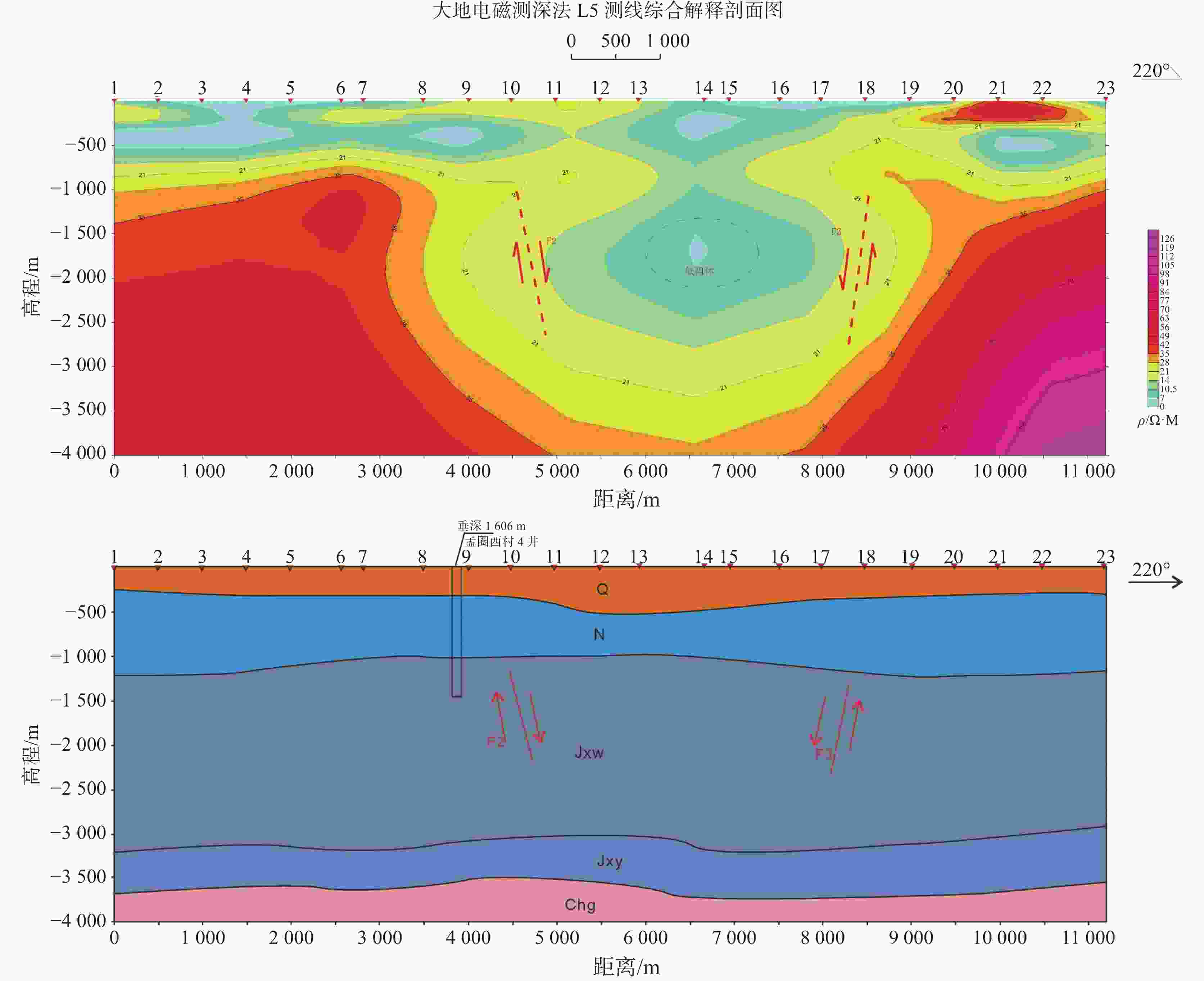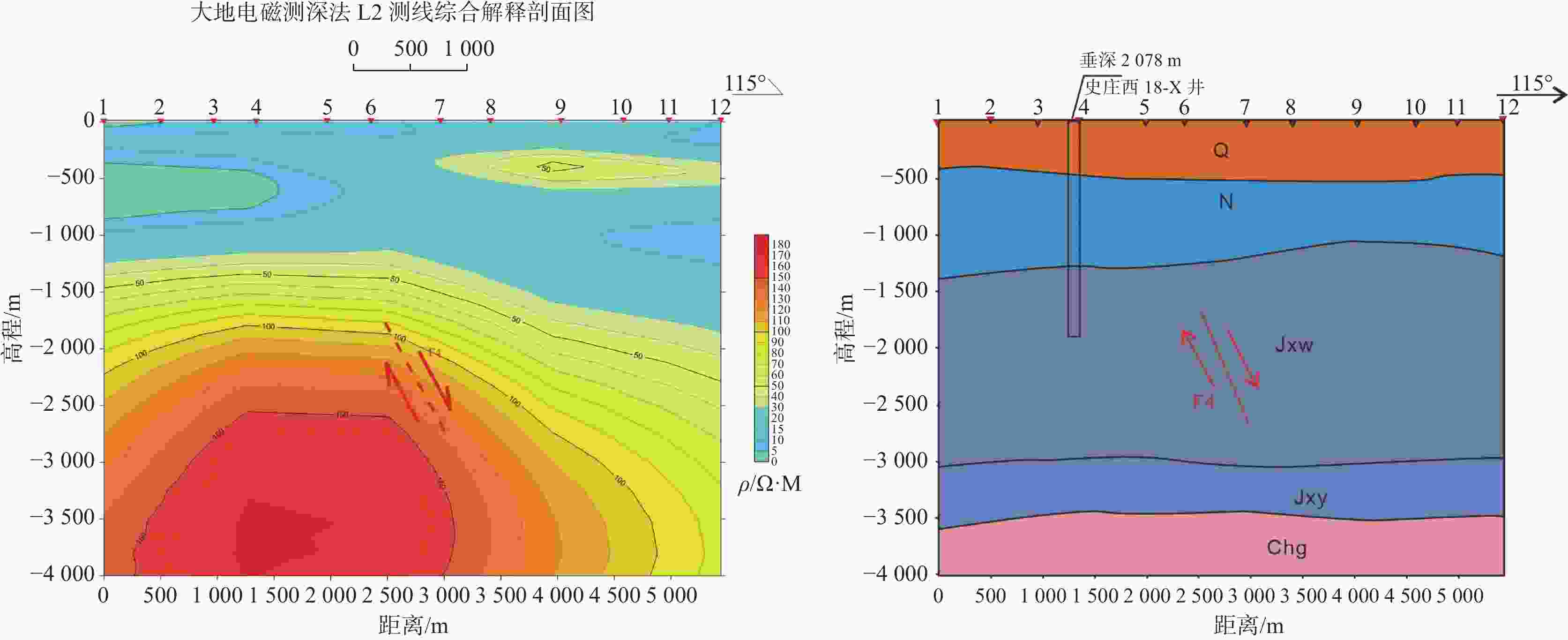 地层 L2测线点号或井名位置内地层深度/m 4点 SZX18-X井 第四系 455 454.97 新近系 1288 1228.55 蓟县系雾迷山组 2990 2078.98 ▽蓟县系杨庄组 3490 / 长城系高于庄组 4000 / 表 5 测点预测地层深度与地热井实钻地层深度对比表