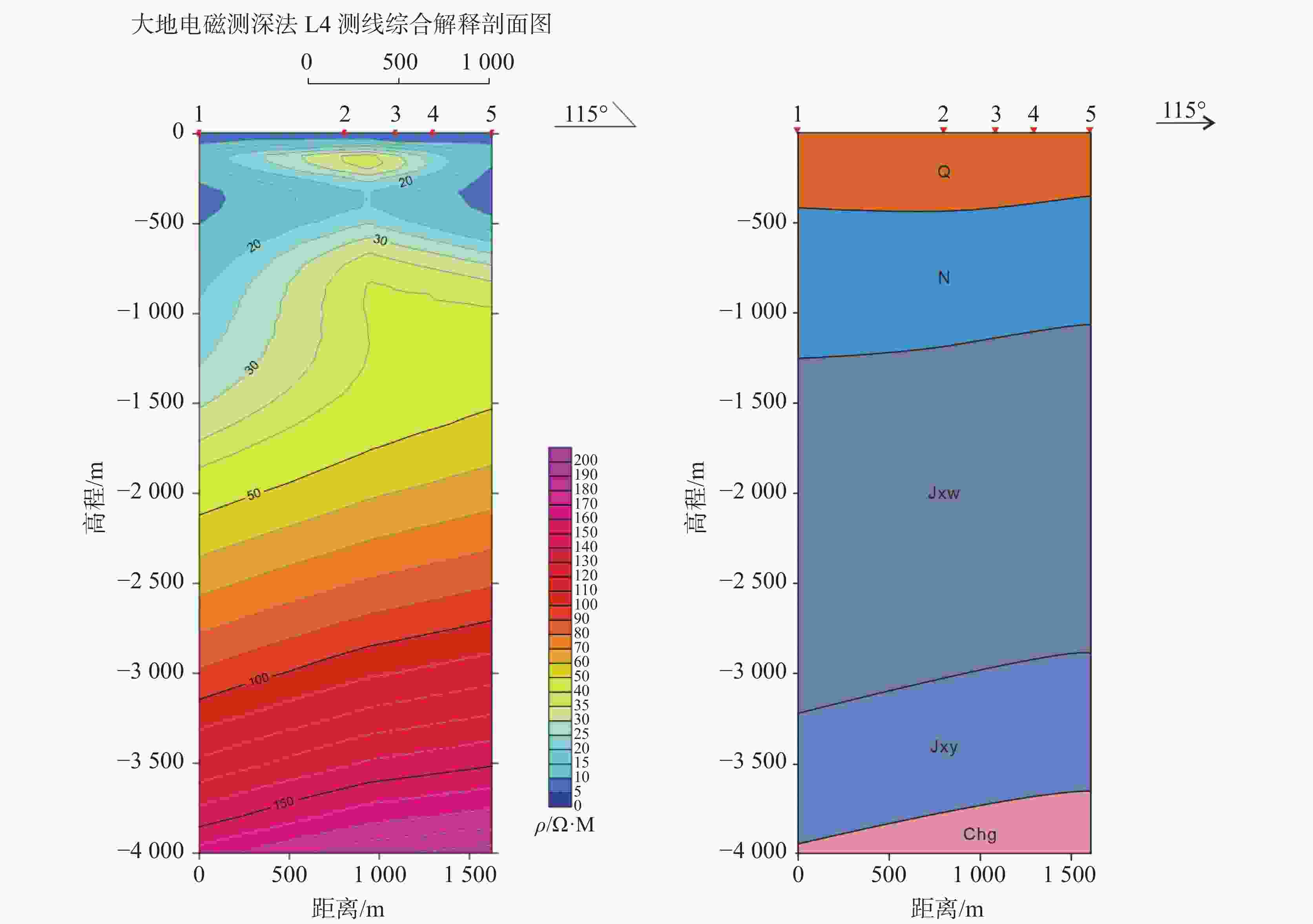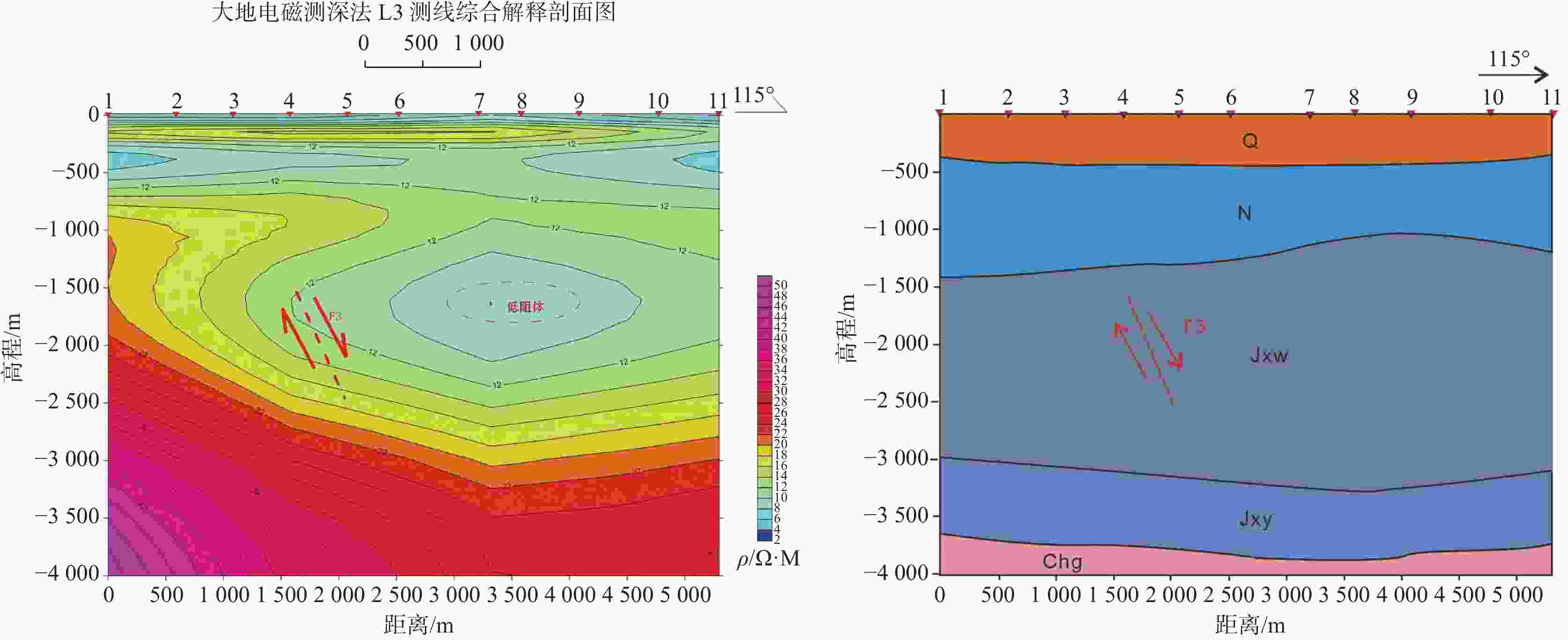 地层 L1测线点号或井名位置内地层深度/m 3点 LYC1井 4点 RX1井 第四系 440 440 450 449.98 新近系 1291 1291.07 1196 1196.34 蓟县系雾迷山组 3185 1987.57 ▽3165 1840.81 ▽蓟县系杨庄组 3710 / 3690 / 长城系高于庄组 4000 / 4000 / 表 4 测点预测地层深度与地热井实钻地层深度对比表