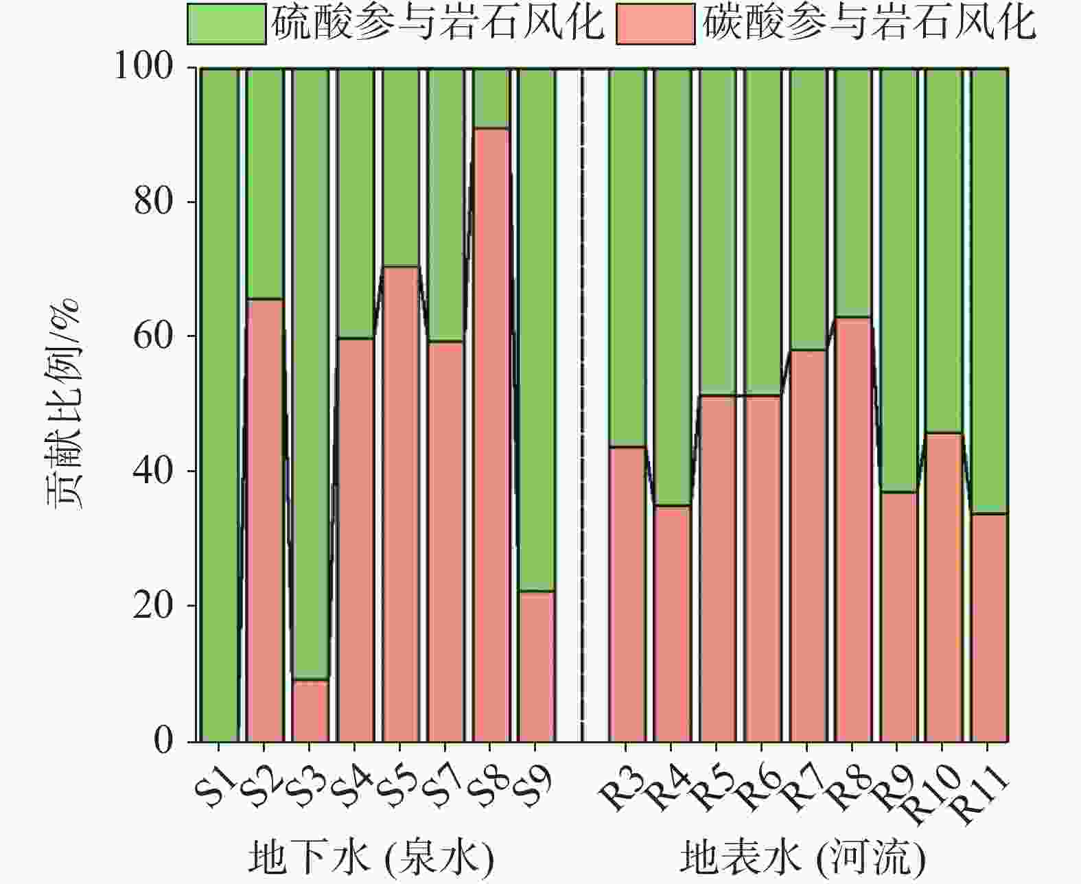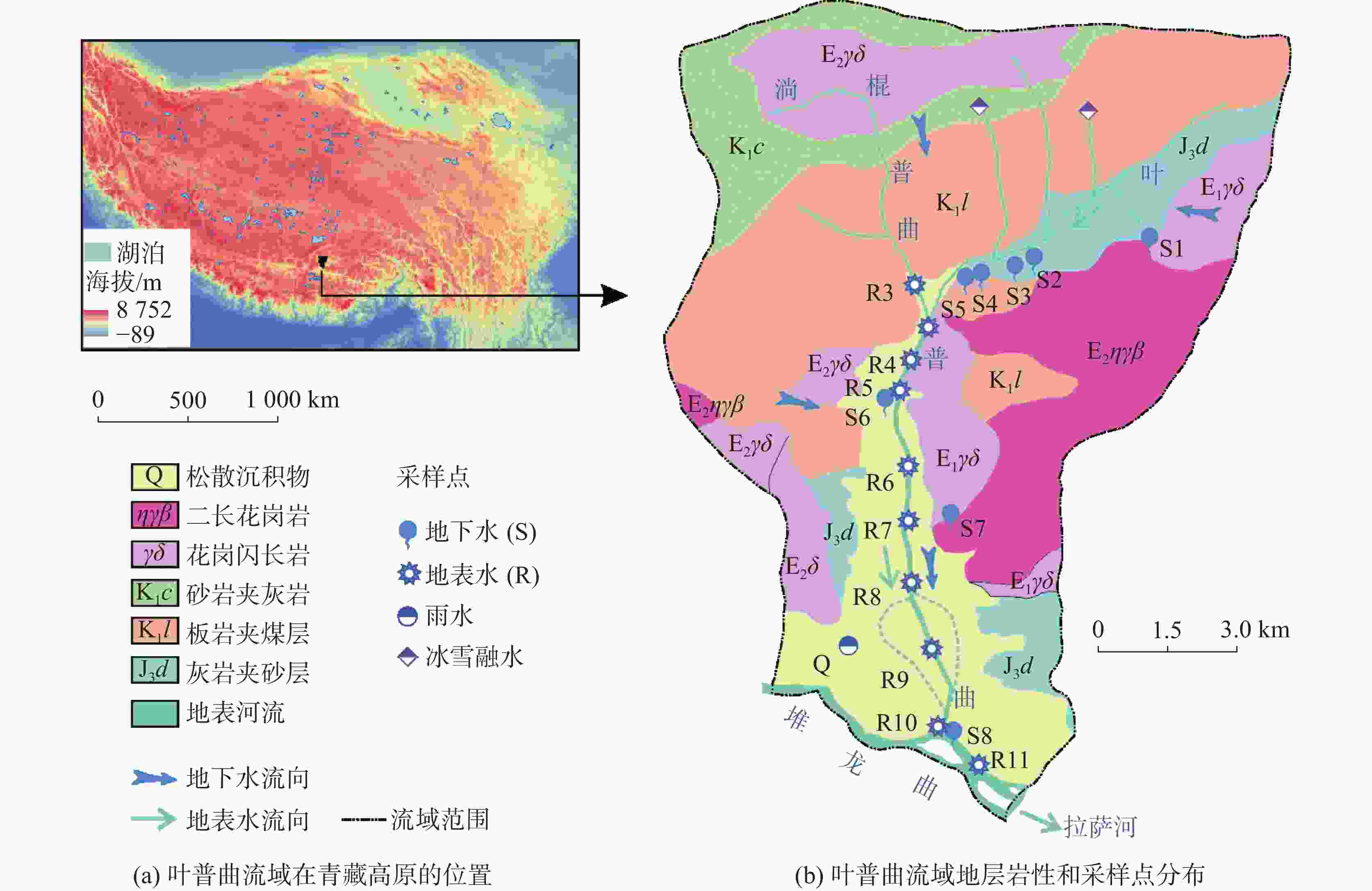 摘要: 研究典型流域水化学和同位素组成对青藏高原水资源保护具有重要意义。本研究以青藏高原南部叶普曲为例,系统采集了泉水、河流、雨水和冰雪融水,分析其水化学和同位素组成,剖析流域水循环和岩石风化机制。结果表明:(1)泉水和河流水化学类型以Ca-HCO3型为主(占88%),其次为Ca-HCO3·SO4(占12%)。(2)利用氢氧同位素分割径流,得到冰雪融水和雨水对泉水的贡献分别为84%和16%;河流水补给来源中冰雪融水和地下水占68%,雨水占32%。(3)大气降水、碳酸盐岩和硅酸盐岩风化是流域水体溶质主要来源;硫酸和碳酸共同参与流域岩石风化,其中硫酸分别贡献泉水和河流阳离子总量的53%和52%。(4)泉水氘过量参数d值分布分散,揭示流域多数泉水属于独立的水文地质单元;河流分布集中,表明河流补给来源较泉水稳定。研究明确了叶普曲地下水和地表水水化学特征及成因机制,指出了硫化物氧化产酸对岩石风化的贡献,丰富了青藏高原流域水和物质循环理论研究,有利于地表水和地下水资源的保护和合理开发。Abstract: The Tibetan Plateau, known as the "Asian Water Tower," plays a critical role in regional water resource sustainability. This study focuses on the water cycle processes and hydrogeochemical mechanisms in the Yepuqu Basin, southern Tibet, through systematic sampling of spring water, river water, snowmelt, and rainwater (21 samples collected in June2023). By integrating hydrochemical analysis, hydrogen-oxygen isotope tracers (δD, δ18O), and deuterium excess (d-excess) parameters, the research investigates water cycle pathways, solute sources, and rock weathering dynamics. Key findings include: (1) Water chemistry predominantly follows the Ca-HCO3 type (88%), with Ca-HCO3·SO4 as a secondary classification (12%). Isotopic runoff separation reveals distinct recharge patterns: spring water derives 84% from snowmelt and 16% from rainfall, while river water combines 68% from snowmelt/groundwater and 32% from rainfall. Downstream analysis shows a gradual decrease in snowmelt and groundwater contributions along the river course. (2) Solutes originate primarily from atmospheric deposition, carbonate weathering, and silicate dissolution. Rainwater contributes 7.6% of total cations and 4.2% of ${\rm{SO}}_4^{2-}$ in springs, compared to 6.7% and 2.5% in rivers. Notably, sulfuric acid weathering dominates cationic contributions, accounting for 53% in springs and 52% in rivers—surpassing carbonate weathering inputs. This phenomenon is attributed to sulfide oxidation in coal-bearing strata, which generates substantial acidity within the basin. (3) Springs exhibit highly variable d-excess values (7.5‰−22.4‰) indicating isolated hydrogeological units with diverse recharge pathways. In contrast, river waters display clustered d-excess signatures (11.2‰−12.7‰), reflecting stable recharge sources. The downstream decline in river d-excess values suggests increasing groundwater contributions along the flow path. This study pioneers the quantification of sulfide oxidation as the dominant driver of rock weathering in Tibetan Plateau basins. The d-excess parameter is demonstrated to be a robust indicator for identifying aquifer structures and water-rock interactions. These findings advance the understanding of cryospheric hydrogeochemical processes and provide a scientific foundation for sustainable water resource management in high-altitude regions. The integration of multi-isotope tracers with hydrochemical proxies establishes a replicable framework for diagnosing water cycle dynamics in complex alpine environments. The methodology resolves critical uncertainties in distinguishing atmospheric, cryospheric, and lithospheric contributions to riverine systems. By elucidating the coupling mechanisms between sulfide-rich strata weathering and water quality evolution, this work highlights the vulnerability of Tibetan water resources to geological and climatic perturbations. The dominance of sulfuric acid weathering underscores the need to reassess carbon sink calculations in high-altitude basins, traditionally attributed to carbonate dissolution. This research enhances predictive models of water resource responses to glacier retreat and permafrost degradation, offering actionable insights for policymakers engaged in transboundary water governance across the Third Pole region.