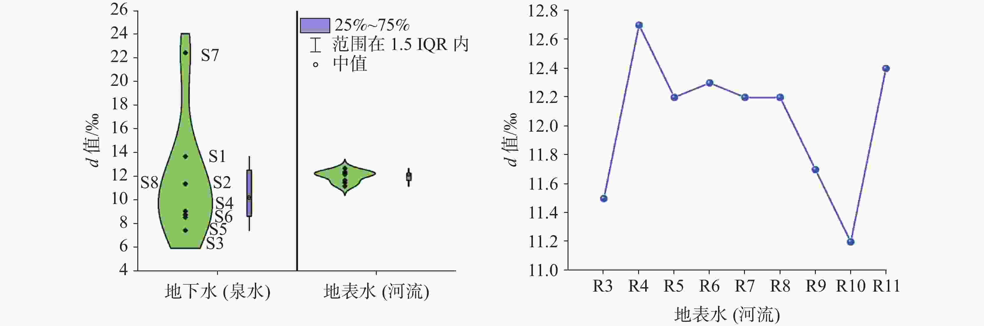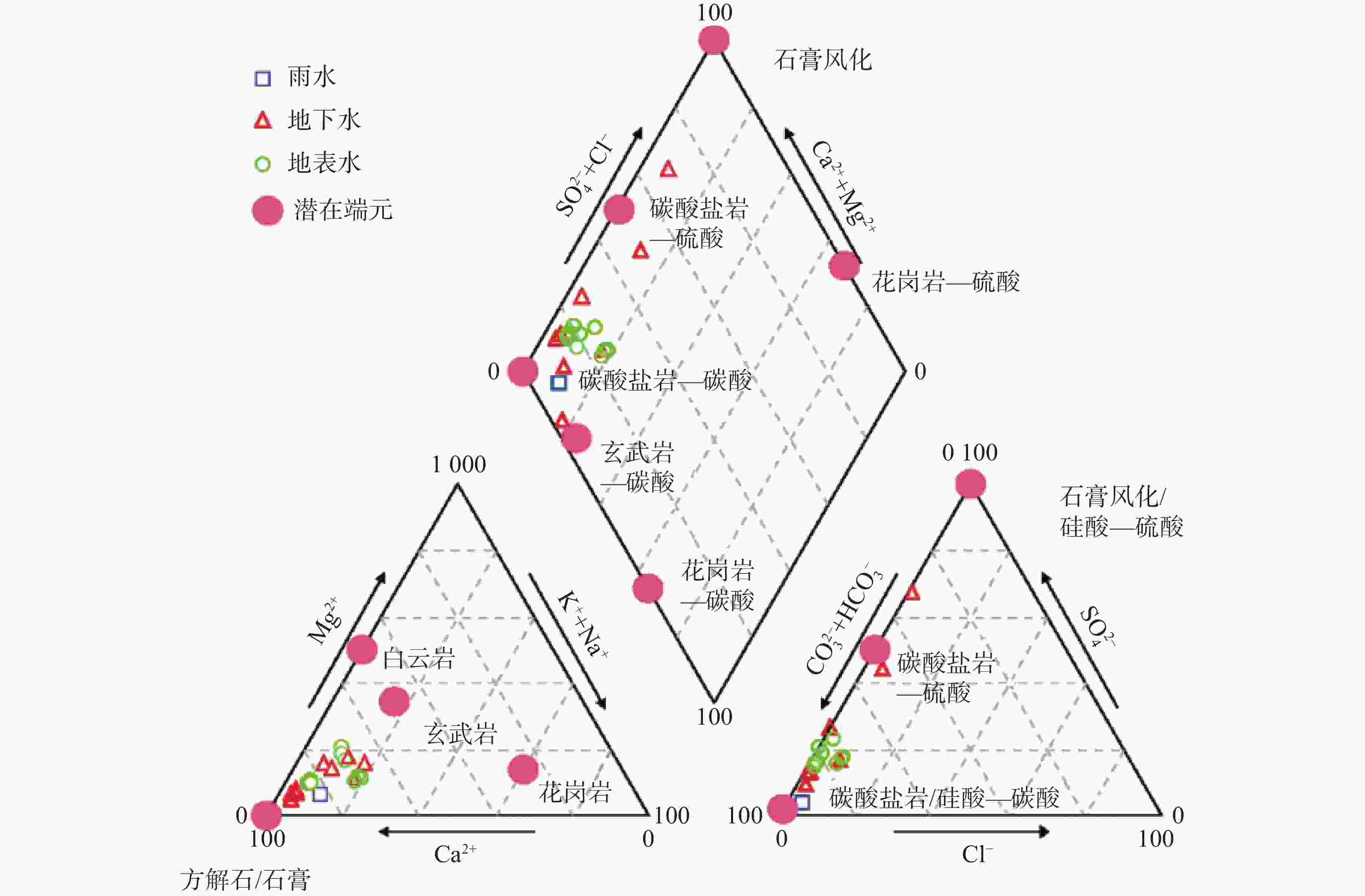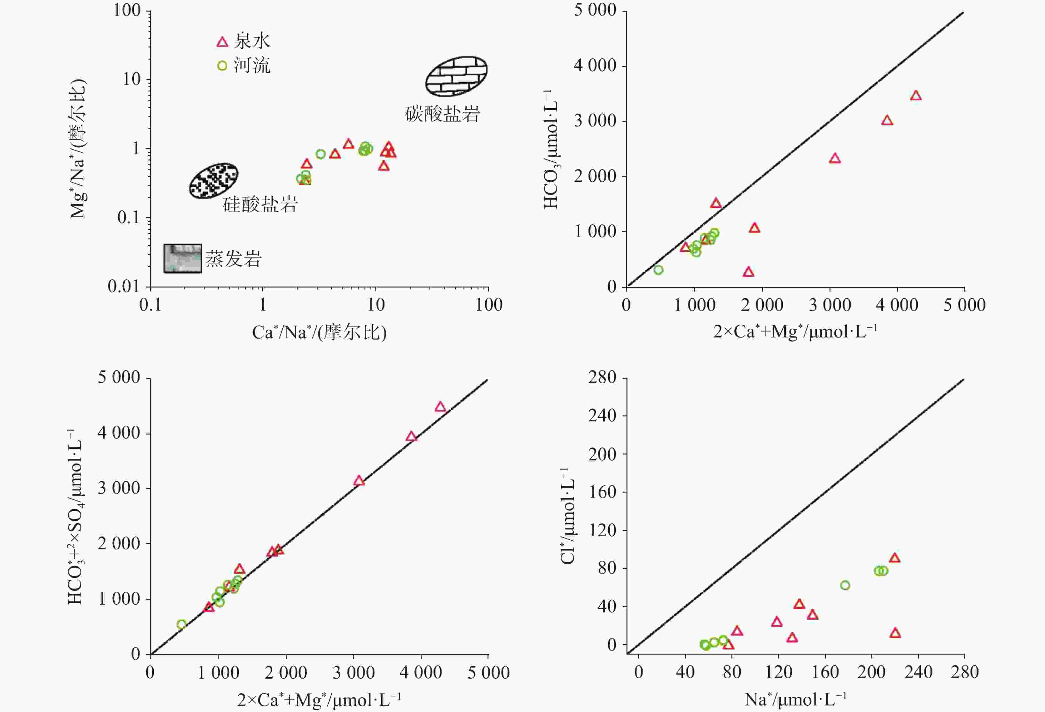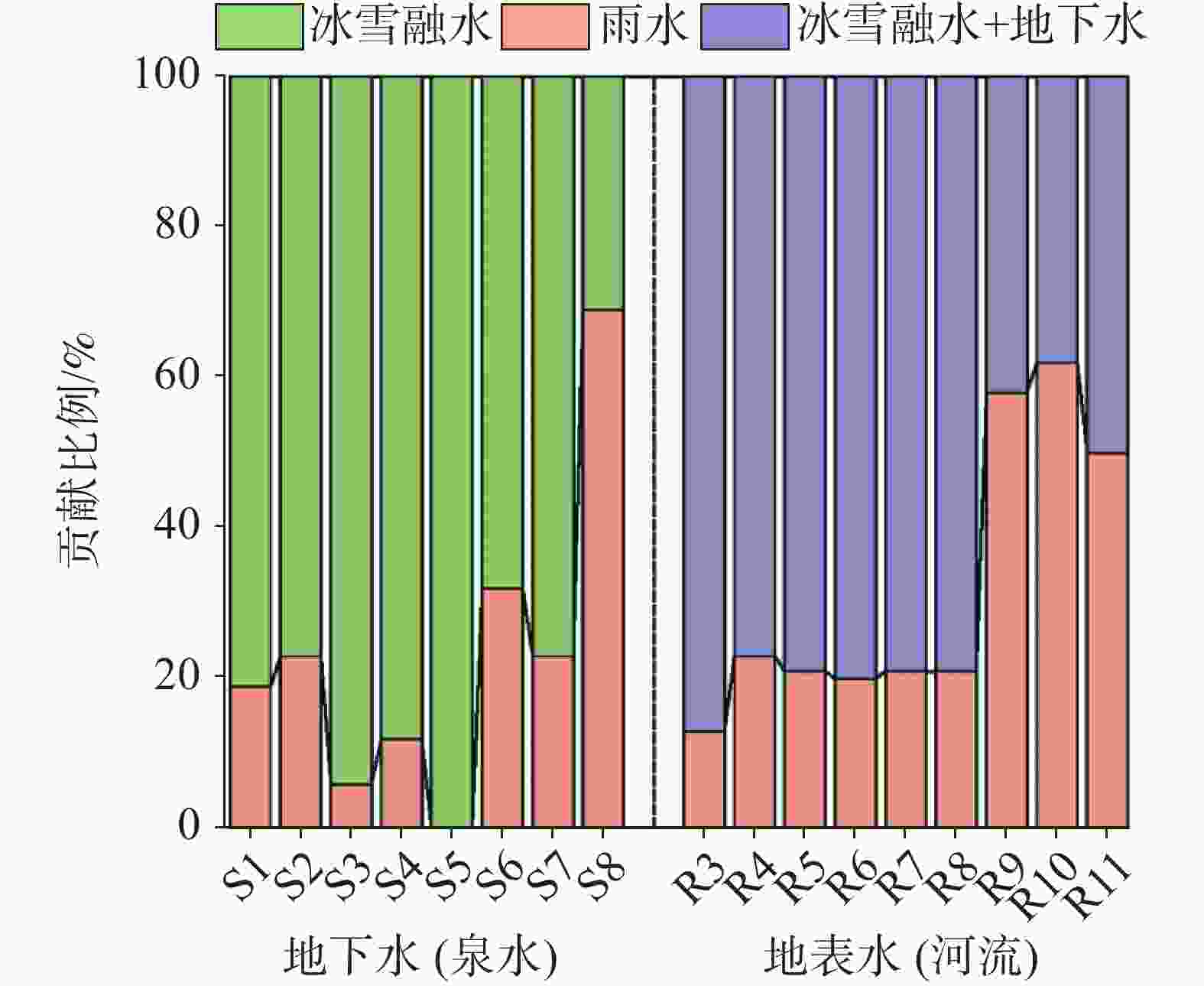 采样点类型 ID pH T K+ Na+ Ca2+ Mg2+ ${\rm{HCO}}_3^{-}$ Cl− ${\rm{SO}}_4^{2-}$ ${\rm{NO}}_3^{-}$ TDS δD δ18O-H2O d-excess 离子平衡 / ℃ /mg·L−1 /‰ /% 泉水 S1 8.2 3.9 0.44 3.20 31.5 3.73 23 0.50 76.97 3.59 128 −125.2 −17.4 13.7 −0.71 S2 7.8 6.2 0.53 3.34 72.7 3.61 191 1.74 45.31 2.52 223 −125.6 −17.1 11.4 −0.86 S3 8.3 16.4 0.13 1.95 37.6 1.10 72 0.18 40.58 0.37 118 −138.4 −18.2 7.5 0.49 S4 8.5 11.5 0.66 2.90 59.0 2.60 149 1.08 39.86 2.11 180 −133.4 −17.8 9.1 −0.50 S5 8.2 8,1 0.44 3.60 82.1 3.14 218 1.34 49.47 1.12 249 −140.5 −18.6 8.6 −1.47 S6 8.5 10.8 0.45 2.12 16.1 1.77 51 0.74 7.82 2.78 54 −123.5 −16.5 8.8 −0.28 S7 8.3 22 3.12 5.22 22.7 3.21 99 0.67 2.67 <0.05* 87 −114.4 −17.1 22.4 0.16 S8 7.9 17.8 2.07 5.21 21.9 1.88 58 3.44 19.51 2.09 83 −101.5 −14.1 11.4 1.09 冰雪融水 R1 8.0 13.2 0.39 1.78 13.0 2.31 37 <0.1 15.10 0.12 51 −134.2 −17.8 8.0 0.09 R2 8.0 12.6 0.32 0.99 7.3 1.18 25 0.25 7.84 2.36 31 −123.7 −17.0 12.6 −9.65 河流 R3 8.2 20.6 0.41 1.48 8.7 1.25 25 0.52 12.46 1.88 37 −120.7 −16.5 11.5 −8.12 R4 8.1 13.4 0.37 1.45 19.4 1.56 45 0.57 16.42 2.49 62 −115.7 −16.1 12.7 1.59 R5 8.4 15.1 0.41 1.59 22.1 1.61 54 0.62 17.25 2.21 71 −116.8 −16.1 12.2 0.43 R6 8.4 14.9 0.42 1.64 23.4 1.64 58 0.64 17.50 2.23 74 −117.1 −16.2 12.3 0.43 R7 8.4 22.9 0.51 1.82 23.7 1.72 62 0.70 18.51 <0.05 78 −116.8 −16.1 12.2 −0.38 R8 8.2 19.7 0.58 1.82 24.5 1.72 66 0.72 18.35 <0.05 81 −116.8 −16.1 12.2 −1.06 R9 8.7 16.6 1.87 4.87 19.0 1.90 52 3.28 19.70 <0.05 77 −102.1 −14.2 11.7 −0.08 R10 8.1 17.9 2.05 4.96 21.4 1.85 60 3.29 19.22 0.06 83 −101.0 −14.0 11.2 0.13 R11 8.1 15,7 1.88 4.21 18.0 1.86 49 2.75 17.76 1.17 71 −104.6 −14.6 12.4 0.76 雨水 P1 −82.5 −11.3 7.8 P2 0.16 0.35 2.9 0.14 16 0.38 1.07 0.43 13 −95.8 −12.8 6.8 −25.23 注:a 表示离子浓度低于检测限 -
